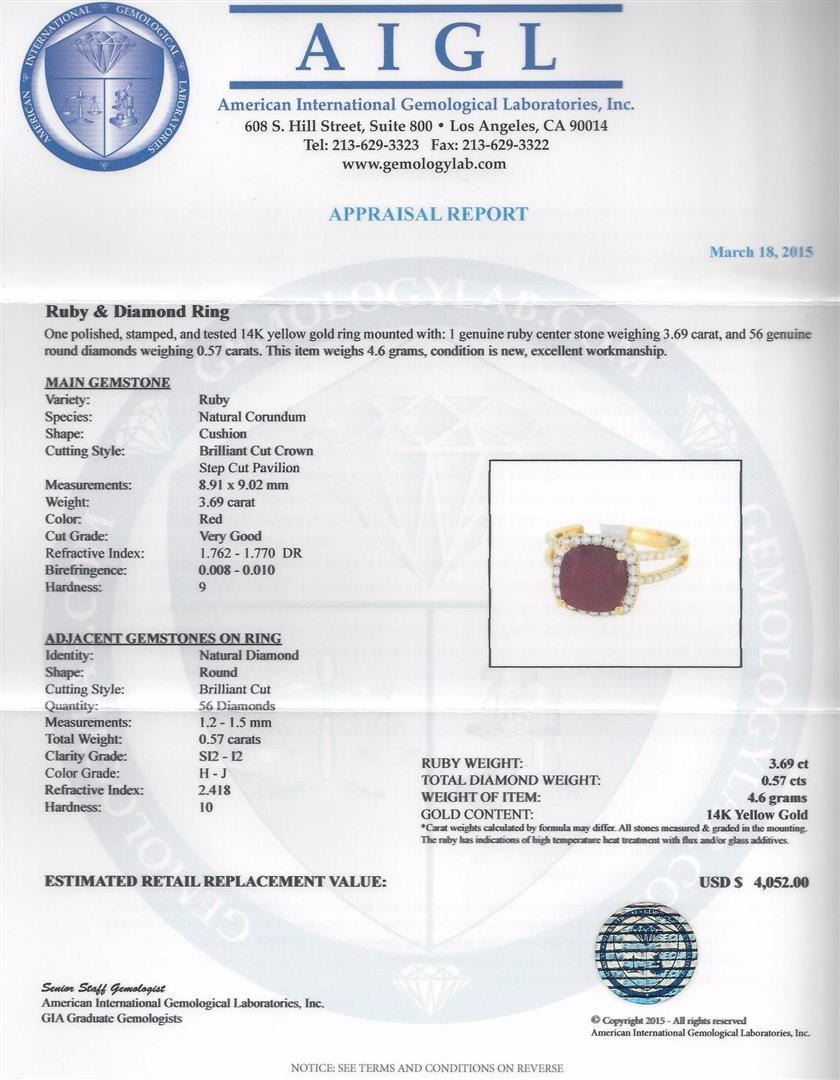 One polished, and tested 14K yellow gold ring mounted with: 1 genuine ruby center stone weighing 3.69 carat, and 56 genuine round diamonds weighing 0.57 carats. This item weighs 4.6 grams, condition is new, excellent workmanship. Main Gemstone: Variety: Ruby. Species: Natural Corundum. Shape: Cushion. Cutting Style: Brilliant Cut Crown Step Cut Pavilion. Measurements: 8.91 x 9.02 mm. Weight: 3.69 carat. Color: Red. Cut Grade: Very Good. Refractive Index: 1.762 - 1.770 DR. Birefringence: 0.008 - 0.010. Hardness: 9. Adjacent Gemstones On Ring: Identity: Natural Diamond. Shape: Round. Cutting Style: Brilliant Cut. Quantity 56 Diamonds. Measurements: 1.2 - 1.5 mm. Total Weight: 0.57 carats. Clarity Grade: SI2-I2. Color Grade: H - J. Refractive Index: 2.418. Hardness: 10. Ruby Weight: 3.69ct. Total Diamond Weight: 0.57cts. Weight Of Item: 4.6 grams. Gold Content: 14K Yellow Gold. AIGL Appraised at $4,052.00.