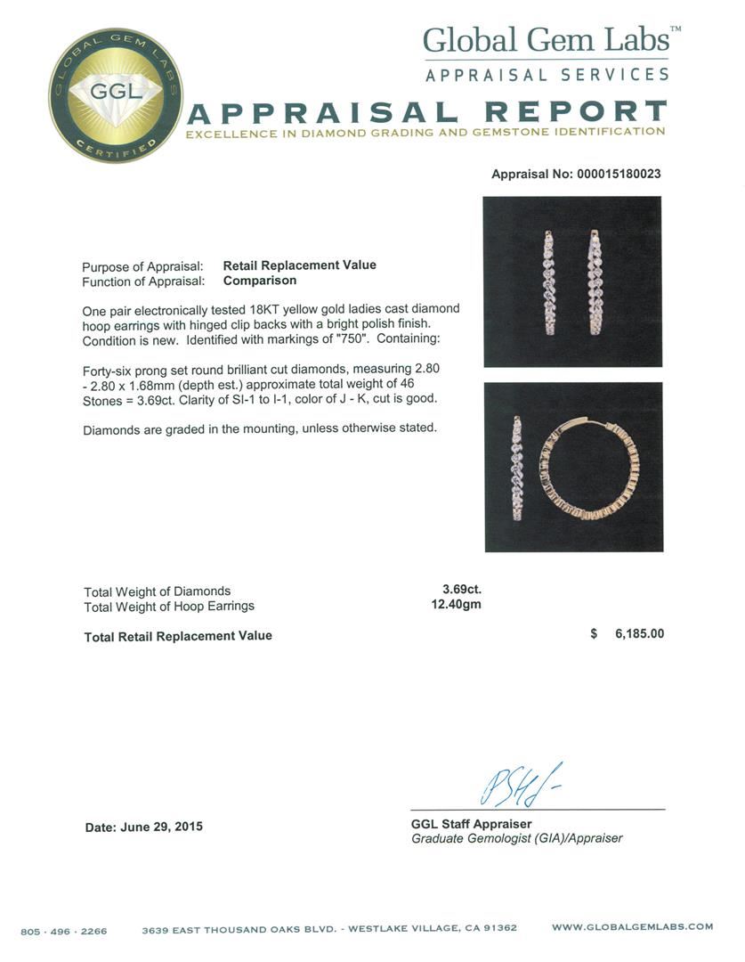 One pair electronically tested 18KT yellow gold ladies cast diamond hoop earrings with hinged clip backs with a bright polish finish. Identified with markings of "750". Condition is new. Containing: Forty-Six prong set round brilliant cut diamonds, measuring 2.80 - 2.80 x 1.68mm (depth est.) approximate total weight of 46 Stones = 3.69ct. Clarity: SI-1 to I-1. Color: J - K, Cut is Good. Diamonds are graded in the mounting, unless otherwise stated. Total Weight of Diamonds 3.69ct. Total Weight of Hoop Earrings 12.40 grams. GGL Appraised at $6,185.00.
