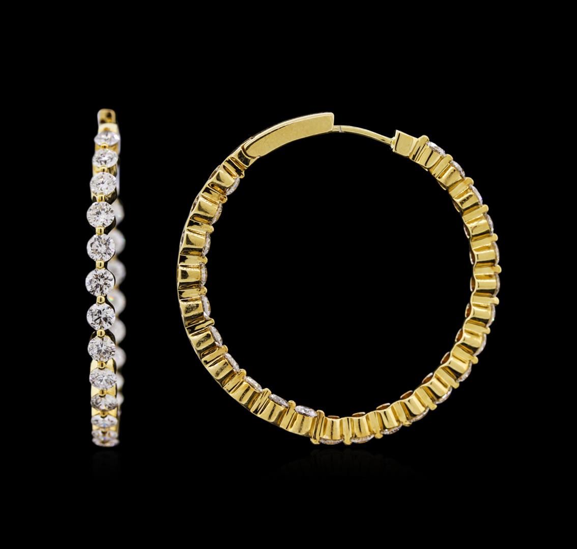 One pair electronically tested 18KT yellow gold ladies cast diamond hoop earrings with hinged clip backs with a bright polish finish. Identified with markings of "750". Condition is new. Containing: Forty-Six prong set round brilliant cut diamonds, measuring 2.80 - 2.80 x 1.68mm (depth est.) approximate total weight of 46 Stones = 3.69ct. Clarity: SI-1 to I-1. Color: J - K, Cut is Good. Diamonds are graded in the mounting, unless otherwise stated. Total Weight of Diamonds 3.69ct. Total Weight of Hoop Earrings 12.40 grams. GGL Appraised at $6,185.00.
