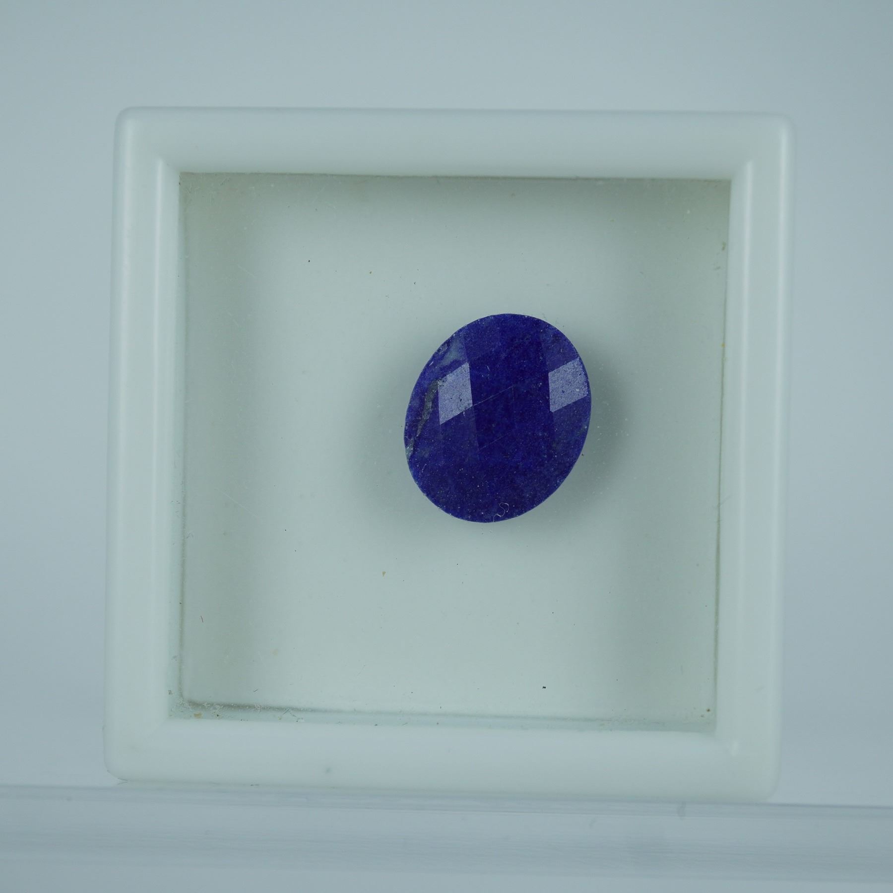 Faceted deep blue lapis lazuli gemstone in an oval checkerboard cut. This vibrant opaque stone displays the classic rich cobalt hue with natural matrix inclusions typical of lapis. Ideal for setting in bold jewelry designs or for collectors seeking unique semi-precious stones. Comes with a protective case.
