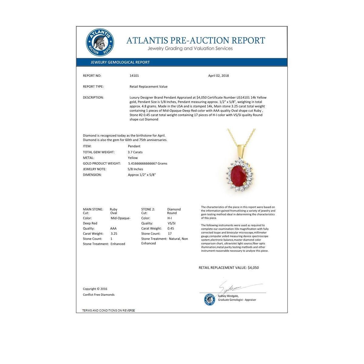 REF-56F5N -14101 ---- 3.70 CTW Ruby & Diamond Pendant 14K Yellow Gold ---- Luxury Designer Brand Pendant Appraised at $4,050 Certificate Number US14101 14k Yellow gold, Pendant Size is 5/8 Inches, Pendant measuring approx. 1/2" x 5/8", weighing in total approx. 4.8 grams. Made in the USA and is stamped 14k, Main stone 3.25 carat total weight containing 1 pieces of Mid-Opaque-Deep Red color with AAA quality Oval shape cut Ruby , Stone #2 0.45 carat total weight containing 17 pieces of H-I color with VS/SI quality Round shape cut Diamond