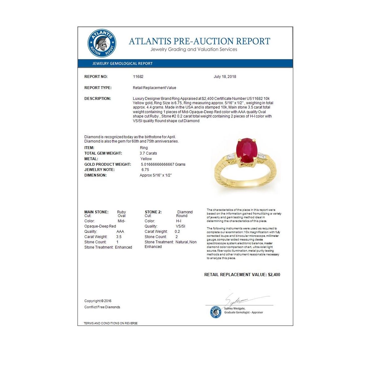 REF-36H8A -11682 ---- 3.70 CTW Ruby & Diamond Ring 10K Yellow Gold ---- Luxury Designer Brand Ring Appraised at $2,400 Certificate Number US11682 10k Yellow gold, Ring Size is 6.75, Ring measuring approx. 5/16" x 1/2" , weighing in total approx. 4.4 grams. Made in the USA and is stamped 10k, Main stone 3.5 carat total weight containing 1 pieces of Mid-Opaque-Deep Red color with AAA quality Oval shape cut Ruby , Stone #2 0.2 carat total weight containing 2 pieces of H-I color with VS/SI quality Round shape cut Diamond