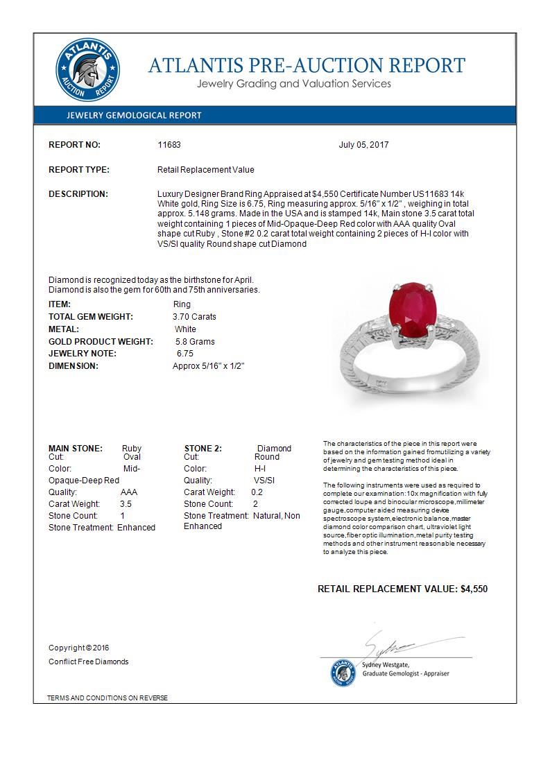 3.70 CTW Ruby & Diamond Ring 14K White Gold ---- Luxury Designer Brand Ring Appraised Retail Price at $4,550 ---- SKU Number US11683 14k White gold Ring Size is 6.75, Ring measuring approx. 5/16" x 1/2" , weighing in total approx. 5.148 grams. Made in the USA and is stamped 14k, Main stone 3.5 carat total weight containing 1 pieces of Mid-Opaque-Deep Red color with AAA quality Oval shape cut Ruby , Stone #2 0.2 carat total weight containing 2 pieces of H-I color with VS/SI quality Round shape cut