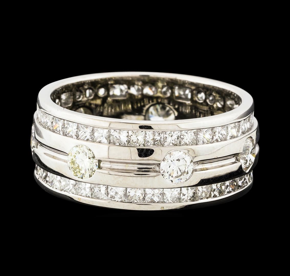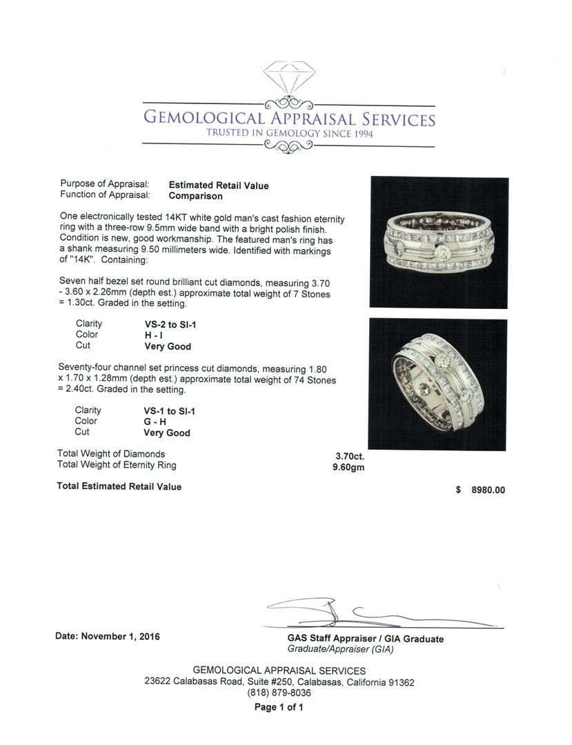 One electronically tested 14KT white gold man's cast fashion eternity ring with a three-row 9.5mm wide band with a bright polish finish. The featured man's ring has a shank measuring 9.50 millimeters wide. Identified with markings of '14K'. Condition is new, good workmanship. Containing: Seven half bezel set round brilliant cut diamonds, measuring 3.70 - 3.60 x 2.26mm (depth est.) approximate total weight of 7 Stones = 1.30ct. Graded in the setting. Clarity VS-2 to SI-1. Color: H - I Cut Very Good Seventy-Four channel set princess cut diamonds, measuring 1.80 x 1.70 x 1.28mm (depth est.) approximate total weight of 74 Stones = 2.40ct. Graded in the setting. Clarity VS-1 to SI-1. Color: G - H Cut Very Good. Total Weight of Diamonds 3.70ct.. Total Weight of Eternity Ring 9.60gm. GAS Appraised at $8,980.00.