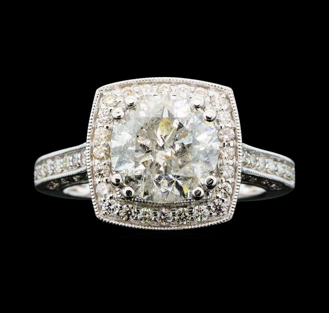 One electronically tested 14KT white gold lady's cast wedding ring with a cushion basket halo with a bright polish with milgrain detailing finish. The featured lady's ring has a shank measuring 1.95 millimeters wide. Identified with markings of '14K'. Condition is new, good workmanship. Containing: One prong set round brilliant cut diamond, measuring 8.87 - 8.84 x 5.93mm (depth est.) , 10.00.%. GTCF approximate weight of 3.10ct. Graded in the setting. Clarity I-1. Color: H - I Cut Very Good Fifty-Eight prong set round brilliant cut diamonds, measuring 1.45 - 1.35 x 0.87mm (depth est.) approximate total weight of 58 Stones = 0.60ct. Graded in the setting. Clarity SI-1 to I-1. Color: H - I Cut Very Good. Total Weight of Diamonds 3.70ct.. Total Weight of Ring 4.80gm. GAS Appraised at $36,475.00.