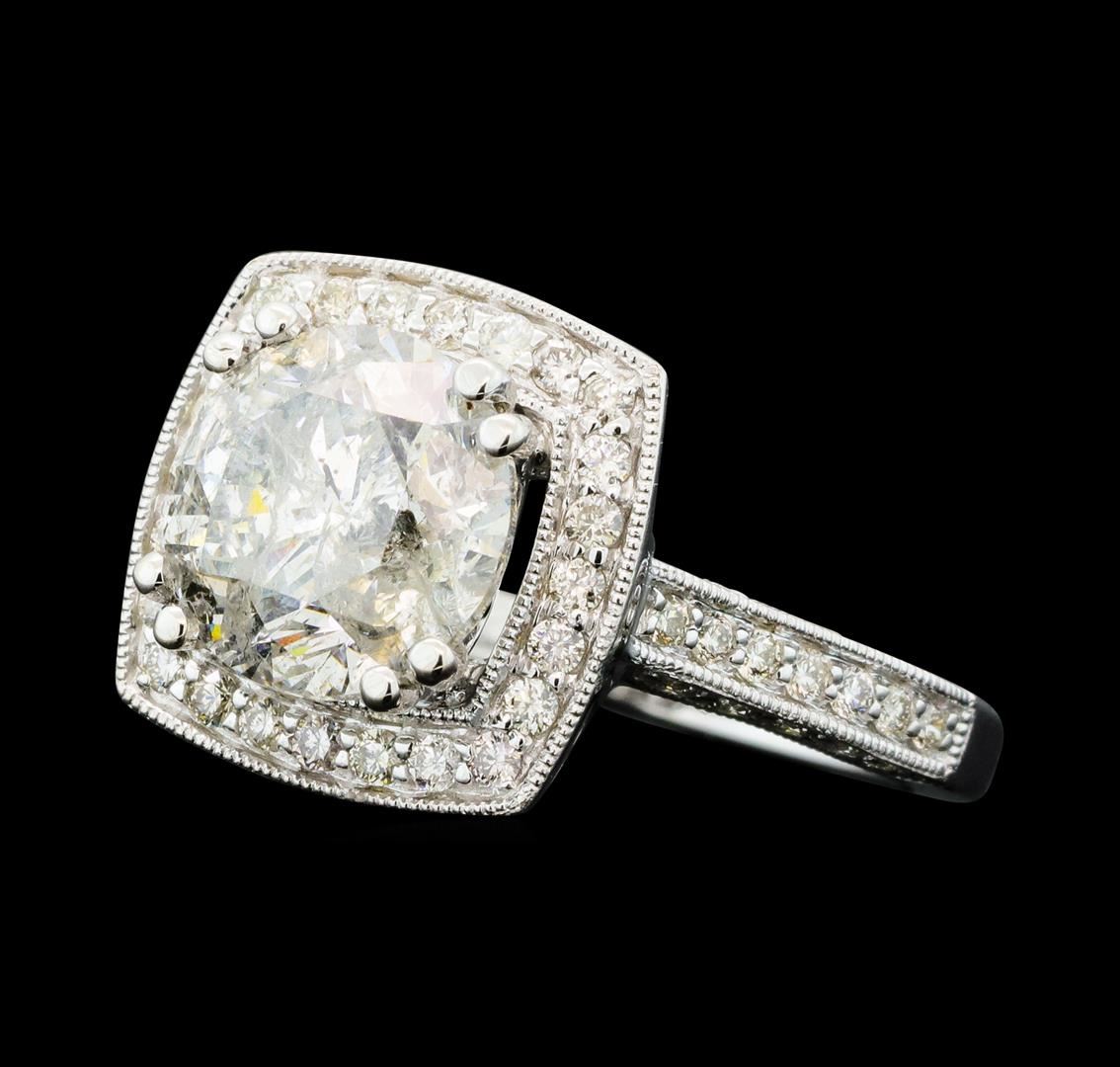 One electronically tested 14KT white gold lady's cast wedding ring with a cushion basket halo with a bright polish with milgrain detailing finish. The featured lady's ring has a shank measuring 1.95 millimeters wide. Identified with markings of '14K'. Condition is new, good workmanship. Containing: One prong set round brilliant cut diamond, measuring 8.87 - 8.84 x 5.93mm (depth est.) , 10.00.%. GTCF approximate weight of 3.10ct. Graded in the setting. Clarity I-1. Color: H - I Cut Very Good Fifty-Eight prong set round brilliant cut diamonds, measuring 1.45 - 1.35 x 0.87mm (depth est.) approximate total weight of 58 Stones = 0.60ct. Graded in the setting. Clarity SI-1 to I-1. Color: H - I Cut Very Good. Total Weight of Diamonds 3.70ct.. Total Weight of Ring 4.80gm. GAS Appraised at $36,475.00.