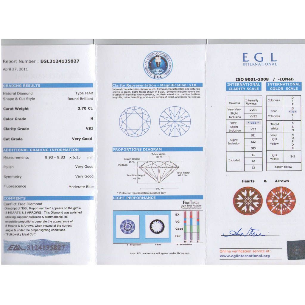 3.70 ctw EGL Certified Round Brilliant H,VS1 **|**|** CTW: 3.70 ; Shape: Round Brilliant ; Diamond Color: H ; Diamond Clarity: VS1; Measurement: 9.83-9.93x6.15; Cut: VG ; Certifiication: EGL ISRAEL ; Girdle: Medium ; MSRP: $113500