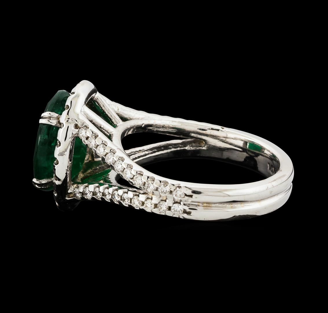 One electronically tested 14KT white gold lady's cast fashion ring with a split cathedral shank with a halo with a bright polish finish. The featured lady's ring has a double shank measuring 3.83 millimeters wide. Identified with markings of '14K'. Condition is new, good workmanship. Containing: One prong set oval modified mixed cut natural emerald, measuring 11.38 x 9.28 x 5.10mm, (depth est.) 20%. bulge factor, approximate weight of 3.70ct., clarity is heavily included, medium dark, moderately strong, green color, (GIA G 6/4), cut is good. Transmitting light somewhat diffusely, semi-transparent to translucent. Naturally occurring internal & external characteristics are present. Indications of oil residue. Colored gemstones are presumed to have been subjected to commonly used enhancement processes. Graded in the setting. Sixty prong set round brilliant cut diamonds, measuring 1.40 - 1.35 x 0.86mm (depth est.) approximate total weight of 60 Stones = 0.60ct. Graded in the setting. Clarity VS-2 to SI-2. Color: H - I Cut Good. Total Weight of Colored Stones 3.70ct.. Total Weight of Diamonds 0.60ct.. Total Weight of Ring 7.30gm. GAS Appraised at $5,575.00.