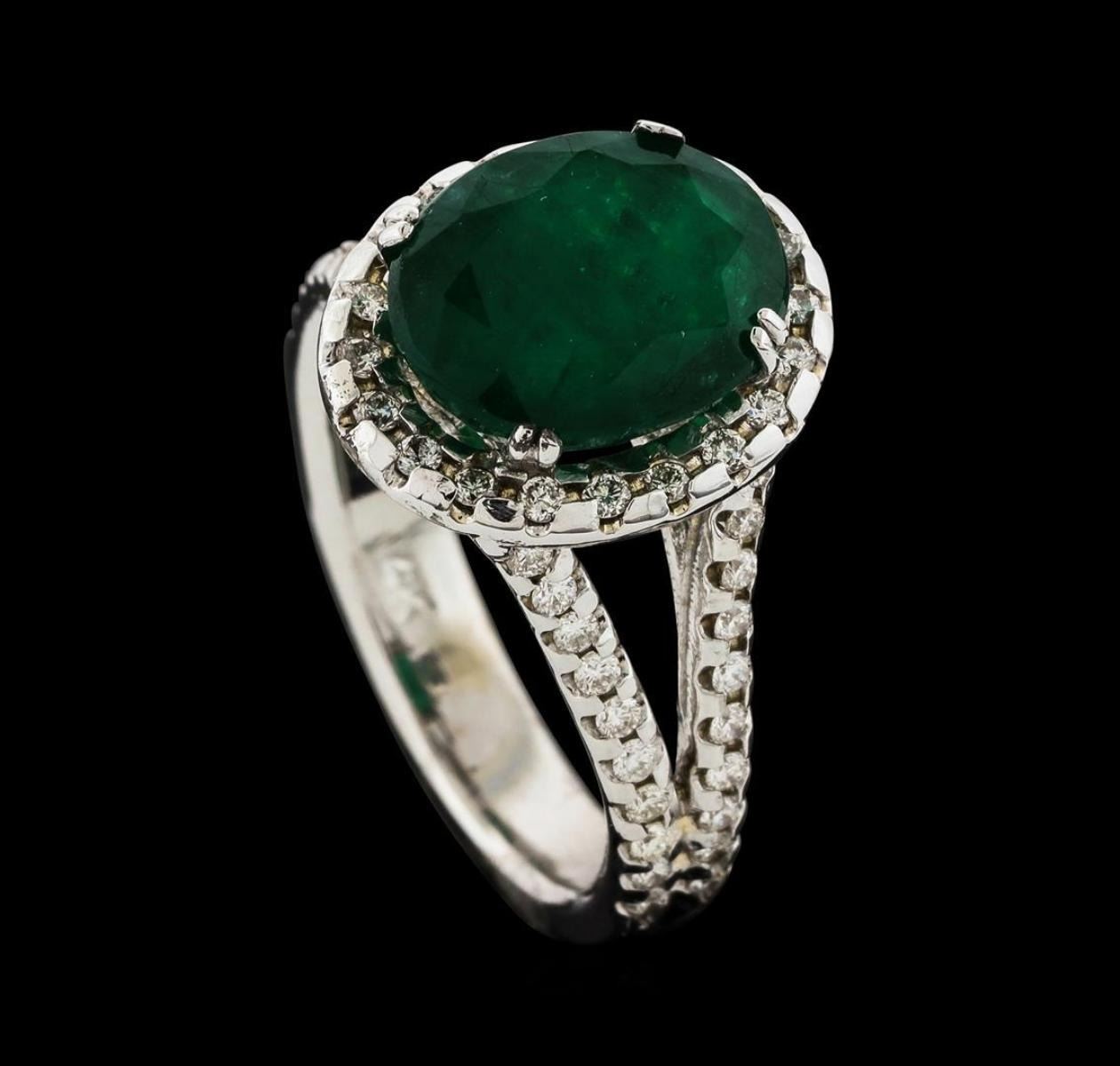 One electronically tested 14KT white gold lady's cast fashion ring with a split cathedral shank with a halo with a bright polish finish. The featured lady's ring has a double shank measuring 3.83 millimeters wide. Identified with markings of '14K'. Condition is new, good workmanship. Containing: One prong set oval modified mixed cut natural emerald, measuring 11.38 x 9.28 x 5.10mm, (depth est.) 20%. bulge factor, approximate weight of 3.70ct., clarity is heavily included, medium dark, moderately strong, green color, (GIA G 6/4), cut is good. Transmitting light somewhat diffusely, semi-transparent to translucent. Naturally occurring internal & external characteristics are present. Indications of oil residue. Colored gemstones are presumed to have been subjected to commonly used enhancement processes. Graded in the setting. Sixty prong set round brilliant cut diamonds, measuring 1.40 - 1.35 x 0.86mm (depth est.) approximate total weight of 60 Stones = 0.60ct. Graded in the setting. Clarity VS-2 to SI-2. Color: H - I Cut Good. Total Weight of Colored Stones 3.70ct.. Total Weight of Diamonds 0.60ct.. Total Weight of Ring 7.30gm. GAS Appraised.