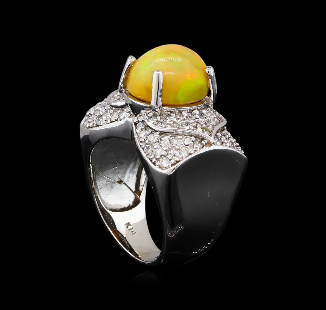 One electronically tested 14KT white gold ladies cast opal and diamond ring with a bright polish finish. The featured opal is set between mirroring stylized diamond galleries supported by tapering shoulders, completed by a four millimeter wide band. Identified with markings of "K14". Condition is new, good workmanship. Containing: One semi crystal opal that is cut in a oval shaped cabochon and is prong set, measuring 11.00 mm long x 9.00 mm wide, and 7.00 mm thick and the approximate weight is 3.70 carats. The opal has a somewhat bright, red multicolor play of color (fire) in a flashfire pattern; a high dome; a good cut; no inclusions; consistent in its brightness and pattern; and is slightly directional. Graded in the setting. Seventy-Eight prong set round brilliant cut diamonds approximate total weight of 78 Stones = 0.75ct. Graded in the setting. Clarity: SI-1 to I-1. Color: E - F. Total Weight of Diamonds 0.75ct. Total Weight of Opals 3.70ct. Total Weight of Ring 11.15gm. AIG Appraised at $5,295.00.