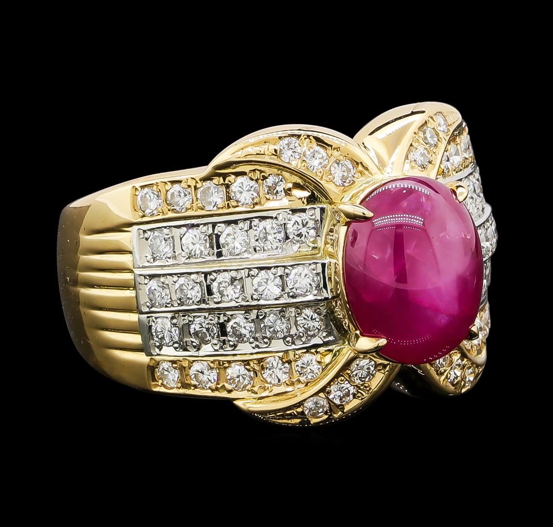 One ring featuring: 18KT Yellow Gold and Platinum containing Star Ruby with a total weight of 3.70ct and Diamonds with a total weight of 0.78ct. Total Weight of Ring: 9.7 grams.