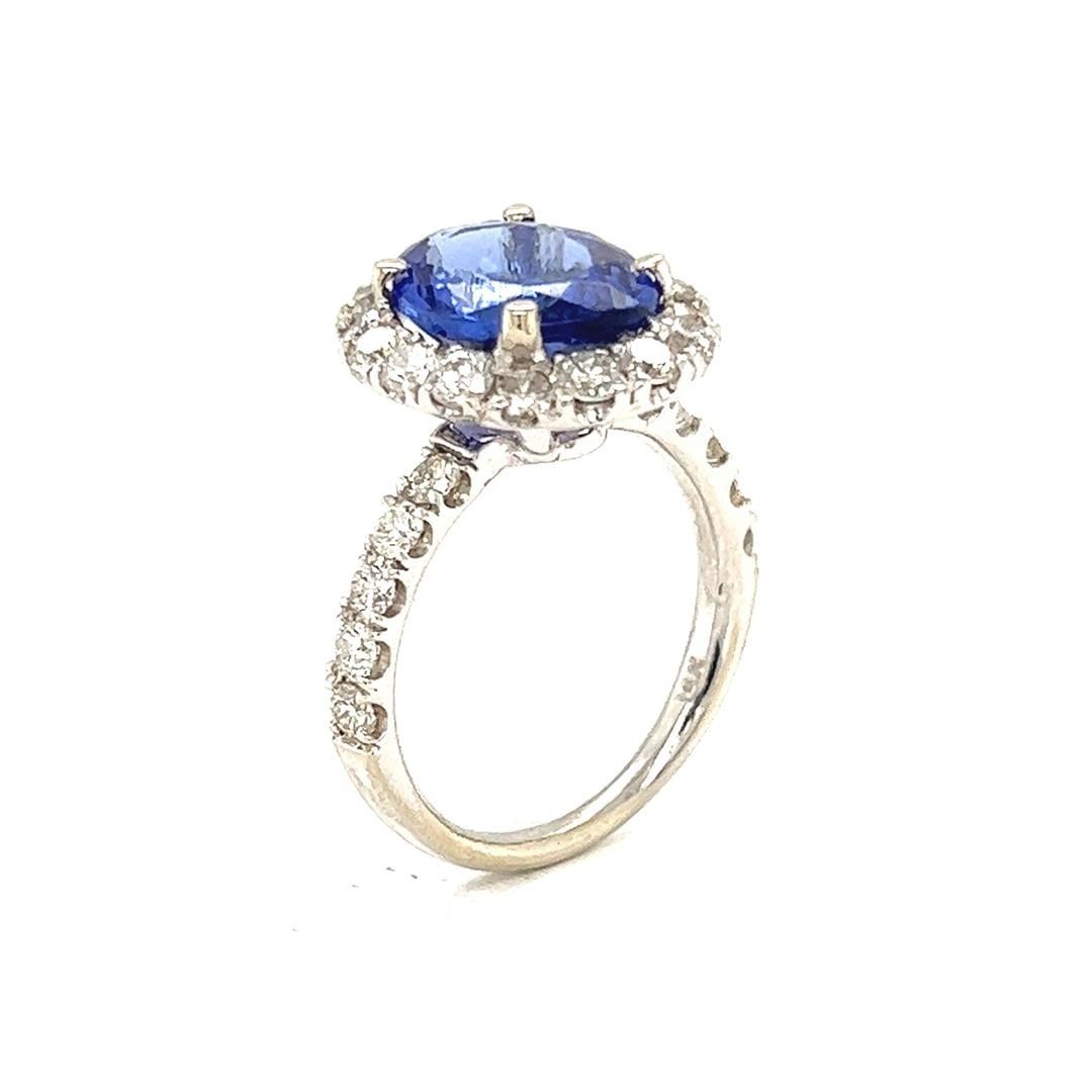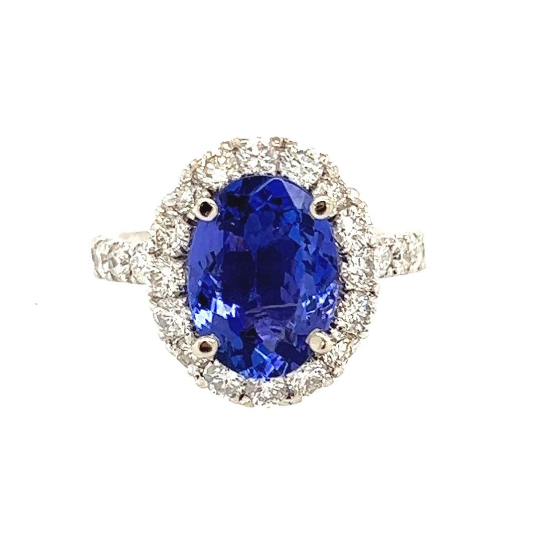 One electronically tested 14KT white gold lady's cast fashion ring with a basket halo with a bright polish finish. Condition is new, good workmanship. The featured lady's ring has a shank measuring 2.10 millimeters wide. Identified with markings of "14K". Containing: One prong set oval modified mixed cut natural tanzanite, measuring 11.58 x 8.60 x 5.30mm, (depth est.) approximate weight of 3.70ct., clarity is eye clean, medium dark, moderately strong, violetish blue color, (GIA vB 6/4), cut is very good. Transmitting light with no distortion, transparent. Colored gemstones are presumed to have been subjected to commonly used enhancement processes. Graded in the setting. Twenty-six prong set round brilliant cut diamonds, measuring 2.40 - 2.25 x 1.45mm (depth est.) approximate total weight of 26 Stones = 1.34ct. Graded in the setting. Color H - I Clarity VS-2 to SI-2 Cut Very Good Total Weight of Colored Stones Total Weight of Diamonds Total Weight of Ring 3.70ct. 1.34ct. 5.00gm Appraisal No: 000022197010 Total Estimated Retail Value $ 9990.00
