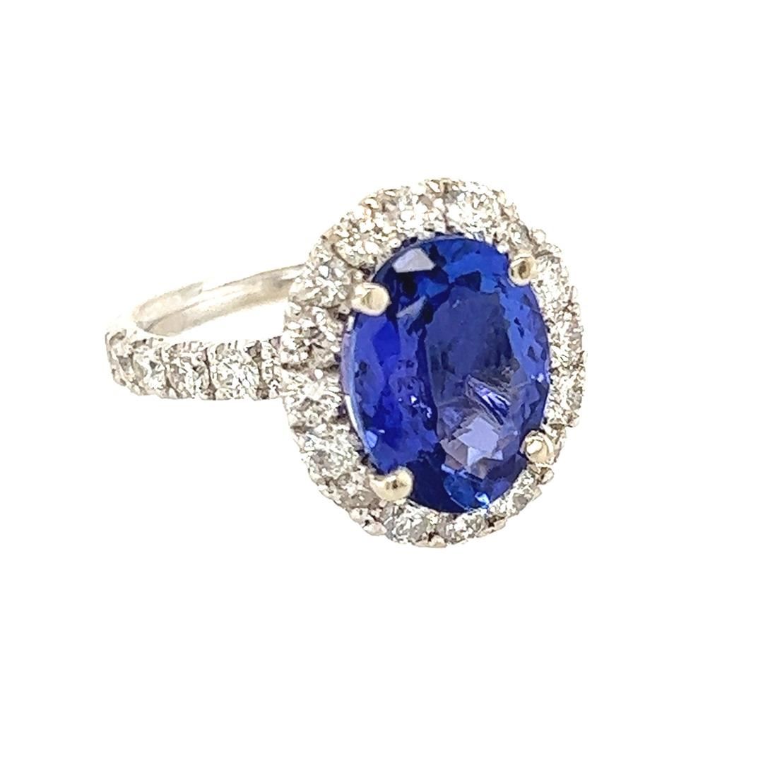 One electronically tested 14KT white gold lady's cast fashion ring with a basket halo with a bright polish finish. Condition is new, good workmanship. The featured lady's ring has a shank measuring 2.10 millimeters wide. Identified with markings of "14K". Containing: One prong set oval modified mixed cut natural tanzanite, measuring 11.58 x 8.60 x 5.30mm, (depth est.) approximate weight of 3.70ct., clarity is eye clean, medium dark, moderately strong, violetish blue color, (GIA vB 6/4), cut is very good. Transmitting light with no distortion, transparent. Colored gemstones are presumed to have been subjected to commonly used enhancement processes. Graded in the setting. Twenty-six prong set round brilliant cut diamonds, measuring 2.40 - 2.25 x 1.45mm (depth est.) approximate total weight of 26 Stones = 1.34ct. Graded in the setting. Color H - I Clarity VS-2 to SI-2 Cut Very Good Total Weight of Colored Stones Total Weight of Diamonds Total Weight of Ring 3.70ct. 1.34ct. 5.00gm Appraisal No: 000022197010 Total Estimated Retail Value $ 9990.00