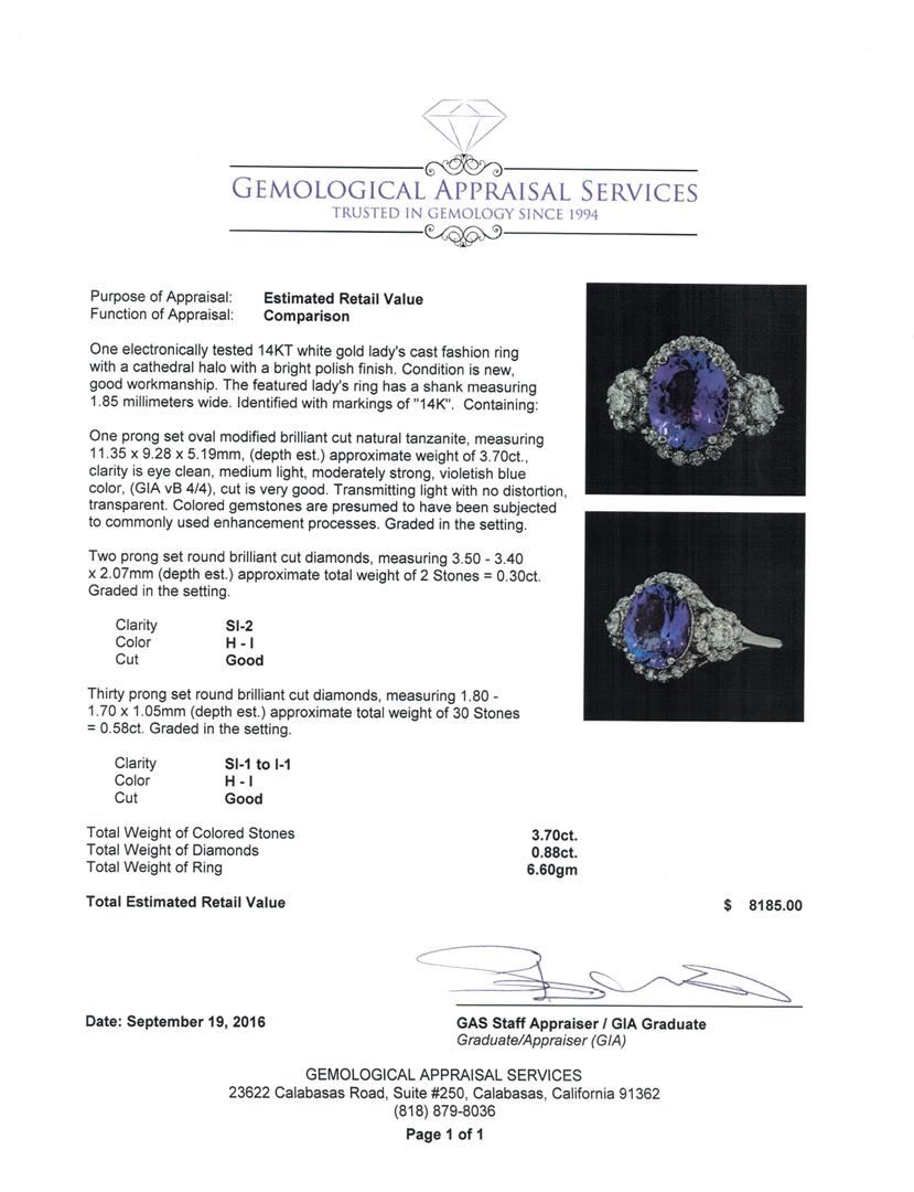 One electronically tested 14KT white gold lady's cast fashion ring with a cathedral halo with a bright polish finish. The featured lady's ring has a shank measuring 1.85 millimeters wide. Identified with markings of '14K'. Condition is new, good workmanship. Containing: One prong set oval modified brilliant cut natural tanzanite, measuring 11.35 x 9.28 x 5.19mm, (depth est.) approximate weight of 3.70ct., clarity is eye clean, medium light, moderately strong, violetish blue color, (GIA vB 4/4), cut is very good. Transmitting light with no distortion, transparent. Colored gemstones are presumed to have been subjected to commonly used enhancement processes. Graded in the setting. Two prong set round brilliant cut diamonds, measuring 3.50 - 3.40 x 2.07mm (depth est.) approximate total weight of 2 Stones = 0.30ct. Graded in the setting. Clarity SI-2. Color: H - I Cut Good Thirty prong set round brilliant cut diamonds, measuring 1.80 - 1.70 x 1.05mm (depth est.) approximate total weight of 30 Stones = 0.58ct. Graded in the setting. Clarity SI-1 to I-1. Color: H - I Cut Good. Total Weight of Colored Stones 3.70ct.. Total Weight of Diamonds 0.88ct.. Total Weight of Ring 6.60gm. GAS Appraised at $8,185.00.