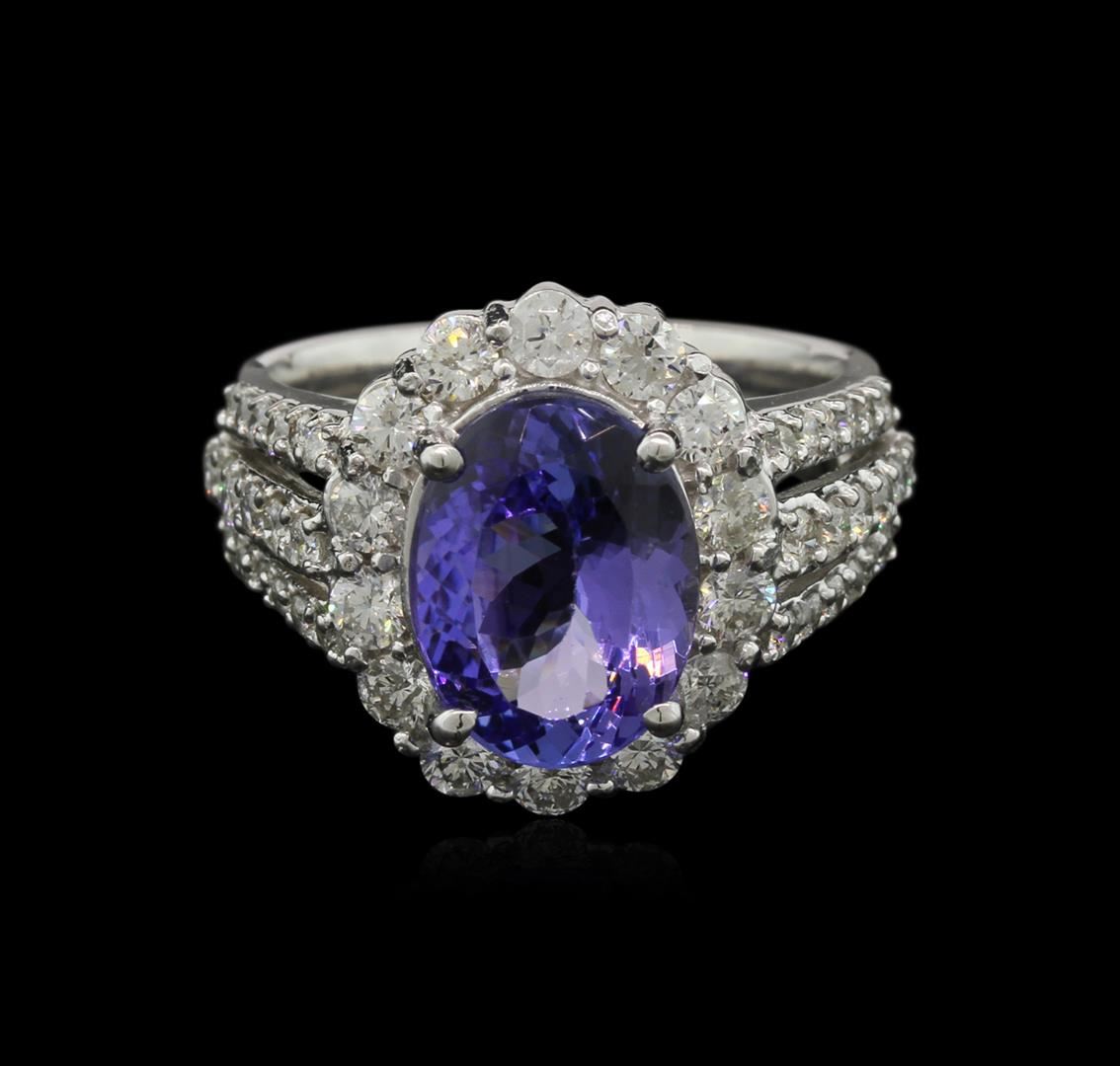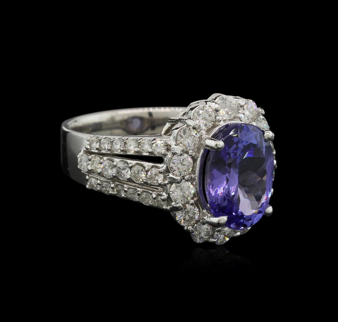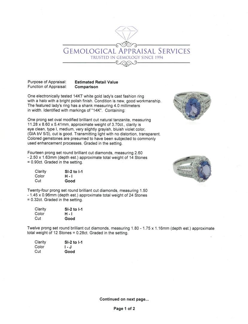 One electronically tested 14KT white gold lady's cast fashion ring with a halo with a bright polish finish. The featured lady's ring has a shank measuring 4.0 millimeters in width. Identified with markings of "14K". Condition is new, good workmanship. Containing: One prong set oval modified brilliant cut natural tanzanite, measuring 11.28 x 8.60 x 5.41mm, approximate weight of 3.70ct., clarity is eye clean, type I, medium, very slightly grayish, bluish violet color, (GIA bV 5/3), cut is good. Transmitting light with no distortion, transparent. Colored gemstones are presumed to have been subjected to commonly used enhancement processes. Graded in the setting. Fourteen prong set round brilliant cut diamonds, measuring 2.60 - 2.50 x 1.63mm (depth est.) approximate total weight of 14 Stones = 0.90ct. Graded in the setting. Clarity: SI-2 to I-1. Color: H - I. Cut Good Twenty-Four prong set round brilliant cut diamonds, measuring 1.50 - 1.45 x 0.96mm (depth est.) approximate total weight of 24 Stones = 0.32ct. Graded in the setting. Clarity: SI-2 to I-1. Color: H - I. Cut Good Twelve prong set round brilliant cut diamonds, measuring 1.80 - 1.75 x 1.16mm (depth est.) approximate total weight of 12 Stones = 0.28ct. Graded in the setting. Clarity: SI-2 to I-1. Color: I - J. Cut Good. Total Weight of Colored Stones 3.70ct. Total Weight of Diamonds 1.50ct. Total Weight of Ring 8.80gm. GAS Appraised at $10,195.00.