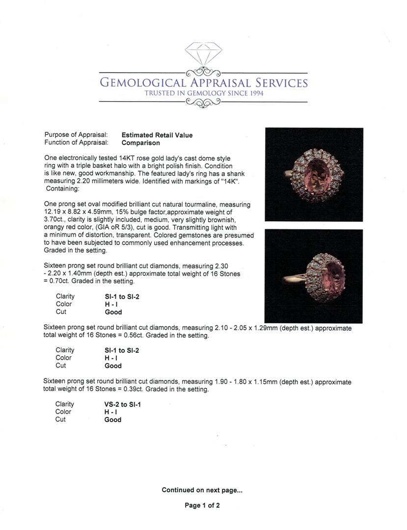 One electronically tested 14KT rose gold lady's cast dome style ring with a triple basket halo with a bright polish finish. The featured lady's ring has a shank measuring 2.20 millimeters wide. Identified with markings of "14K". Condition is like new, good workmanship. Containing: One prong set oval modified brilliant cut natural tourmaline, measuring 12.19 x 8.82 x 4.59mm, 15%. bulge factor, approximate weight of 3.70 ct., clarity is slightly included, medium, very slightly brownish, orangy red color, (GIA oR 5/3), cut is good. Transmitting light with a minimum of distortion, transparent. Colored gemstones are presumed to have been subjected to commonly used enhancement processes. Graded in the setting. Sixteen prong set round brilliant cut diamonds, measuring 2.30 - 2.20 x 1.40mm (depth est.) approximate total weight of 16 Stones = 0.70 ct. Graded in the setting. Clarity: SI-1 to SI-2. Color: H - I. Cut Good Sixteen prong set round brilliant cut diamonds, measuring 2.10 - 2.05 x 1.29mm (depth est.) approximate total weight of 16 Stones = 0.56ct. Graded in the setting. Clarity: SI-1 to SI-2. Color: H - I. Cut Good Sixteen prong set round brilliant cut diamonds, measuring 1.90 - 1.80 x 1.15mm (depth est.) approximate total weight of 16 Stones = 0.39ct. Graded in the setting. Clarity: VS-2 to SI-1. Color: H - I. Cut Good. Total Weight of Colored Stones 3.70 ct. Total Weight of Diamonds 1.65ct. Total Weight of Ring 7.90gm GAS Appraised.