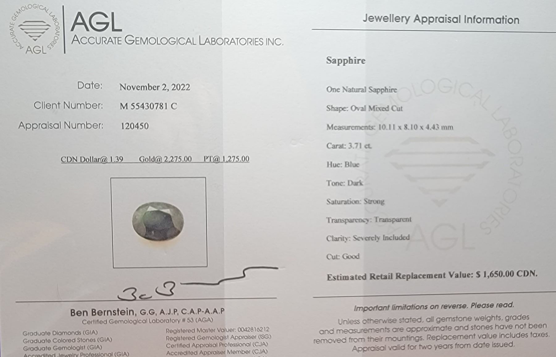 3.71 NATURAL MIDNIGHT BLUE SAPPHIRE GEMSTONE OVAL MIXED CUT GEMSTONE: NATURAL SAPPHIRE APPRAISAL FROM AGL IN DOWNTOWN TORONTO 10.11 X 8.10 X 4.43MM TREATMENT: NONE CLARITY: SI CLARITY ORIGIN: AUSTRALIA FROM A GEMOLOGIST COLLECTION. $1650 APPRAISAL OVAL MIXED CUT - INCLUDES APPRAISAL CERTIFICATE **ALL ITEMS MUST BE REMOVED BY 5PM SATURDAY, JANUARY 21ST 2023. ALL MAGIC SPACE ITEMS MUST BE REMOVED BY WEDNESDAY, JANUARY 18TH AND ARE LOCATED AT 9058-22 AVENUE SW #102. **ALL REMAINING ITEMS WILL BE SUBJECT TO A $6.00 PER DAY STORAGE CHARGE. ANY ITEMS REMAINING AFTER MONDAY, FEBRUARY 6TH, 2023 WILL BE CONSIDERED FORFEITED. NO REFUNDS WILL BE ISSUED FOR FORFEITED ITEMS. TO SCHEDULE A PICK UP APPOINTMENT CLICK HERE