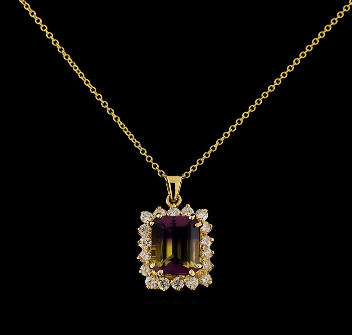 One pendant with chain featuring: 14KT yellow gold weighing 3.93 grams containing one ametrine with a total weight of 3.71ct and diamonds with a total weight of 0.90ct.