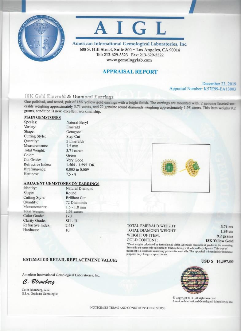 One 3.71ctw Emerald and Diamond Earrings - 18KT Yellow Gold. AIG certified. See Appraisal for more details. AIG Appraised.