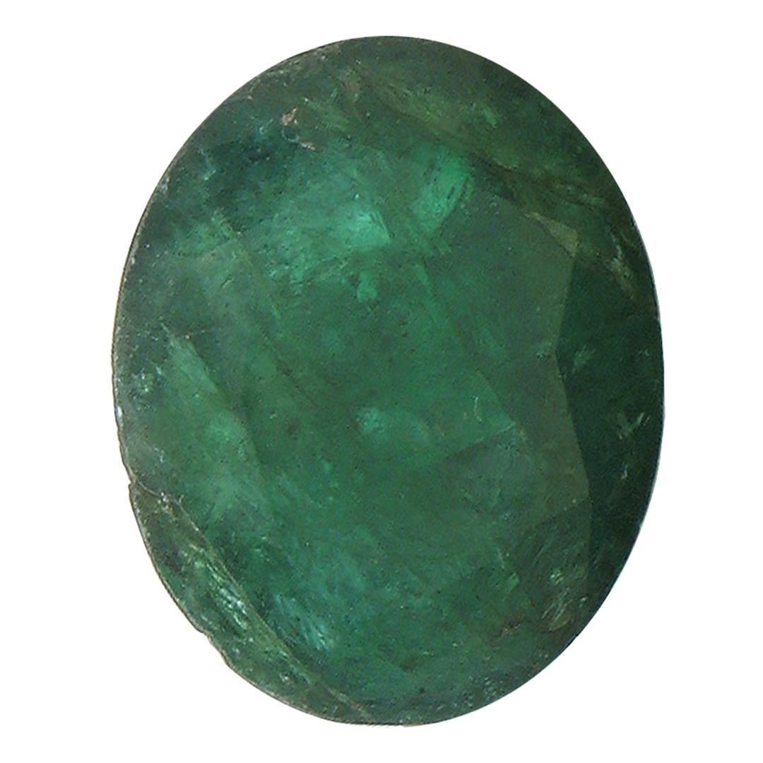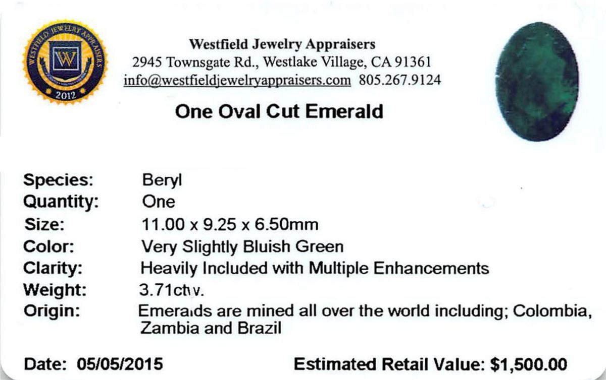 One oval mixed cut natural emerald, measuring 11.00 x 9.25 x 6.50mm, exact weight 3.71ct., clarity is heavily included, medium dark, very slightly bluish green color, (GIA vslbG 6/0) Indications of multiple laboratory enhancements, including high temperature heat treatment. Westfield Appraised at $1,500.00.