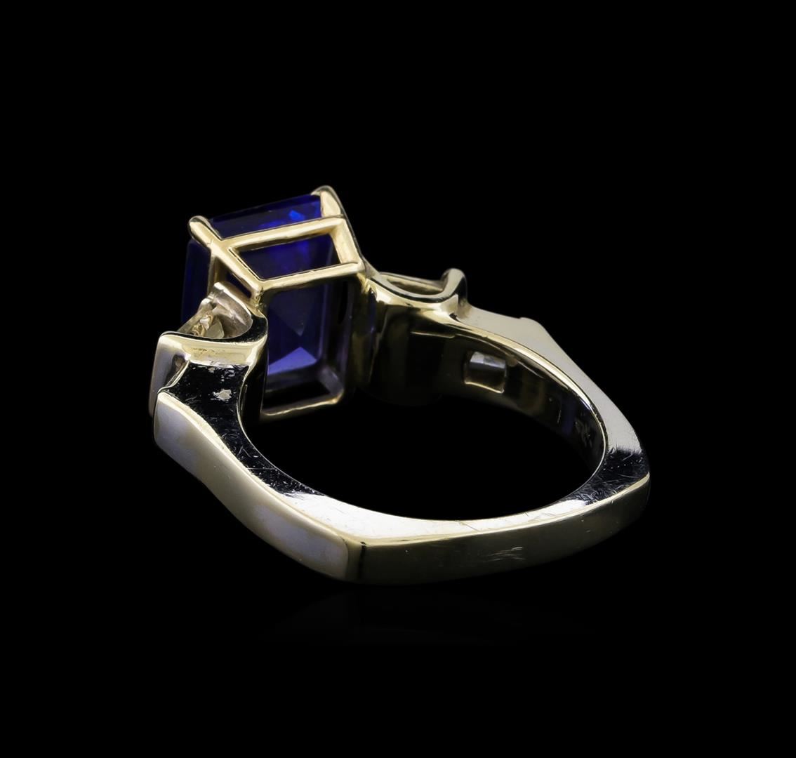 One electronically tested 18KT white gold lady's cast fashion ring with a 3-stone European shank with a bright polish finish. The featured lady's ring has a shank measuring 3.05 millimeters wide. Identified with markings of "18K". Condition is new, good workmanship. Containing: One prong set emerald modified step cut natural tanzanite, measuring 9.84 x 7.89 x 5.43mm, (depth est.) approximate weight of 3.71ct., clarity is eye clean, medium, moderately strong, violetish blue color, (GIA vB 5/4), cut is very good. Transmitting light with no distortion, transparent. Colored gemstones are presumed to have been subjected to commonly used enhancement processes. Graded in the setting. Four channel set baguette cut diamonds, measuring from 4.00 x 1.40 x 1.30mm (depth est.) to 4.10 x 1.45 x 1.50mm (depth est.) approximate total weight of 4 Stones = 0.30ct. Graded in the setting. Clarity: VS-1 to VS-2. Color: G - Very Good Two channel set princess cut diamonds, measuring 2.85 x 2.80 x 2.00mm (depth est.) approximate total weight of 2 Stones = 0.26ct. Graded in the setting. Clarity: VS-1 to VS-2. Color: H - I. Cut Very Good. Total Weight of Colored Stones 3.71ct. Total Weight of Diamonds 0.56ct. Total Weight of Ring 7.40gm. GAS Appraised at $7,745.00.