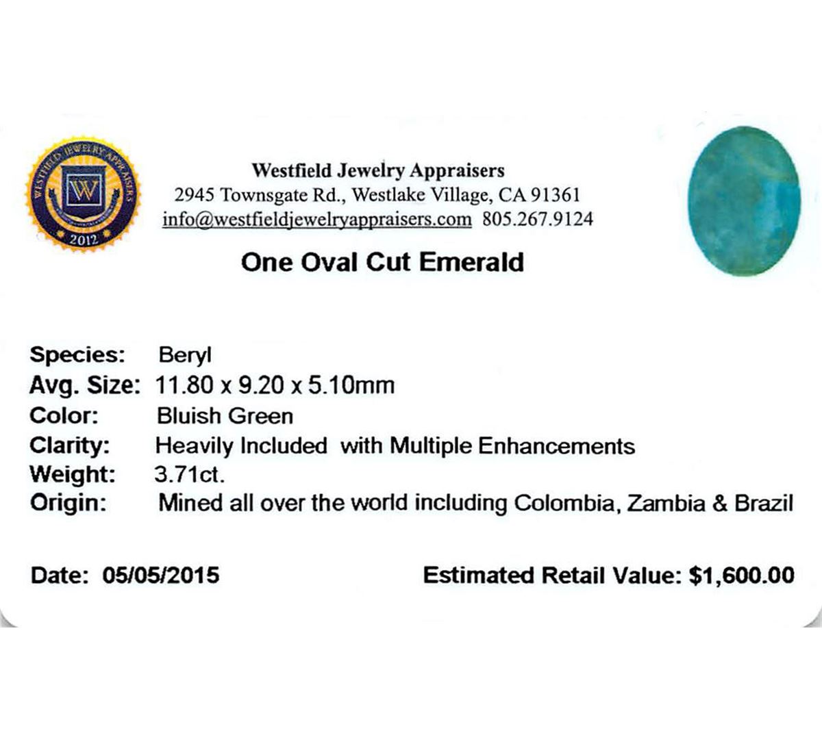 One oval mixed cut natural emerald, measuring 11.80 x 9.20 x 5.10mm, exact weight 3.71ct., clarity is heavily included, type III, dark, very slightly grayish, bluish green color, (GIA bG 7/3), cut is good. Indications of multiple laboratory enhancements, including high temperature heat treatment. Westfield Appraised at $1,600.00.