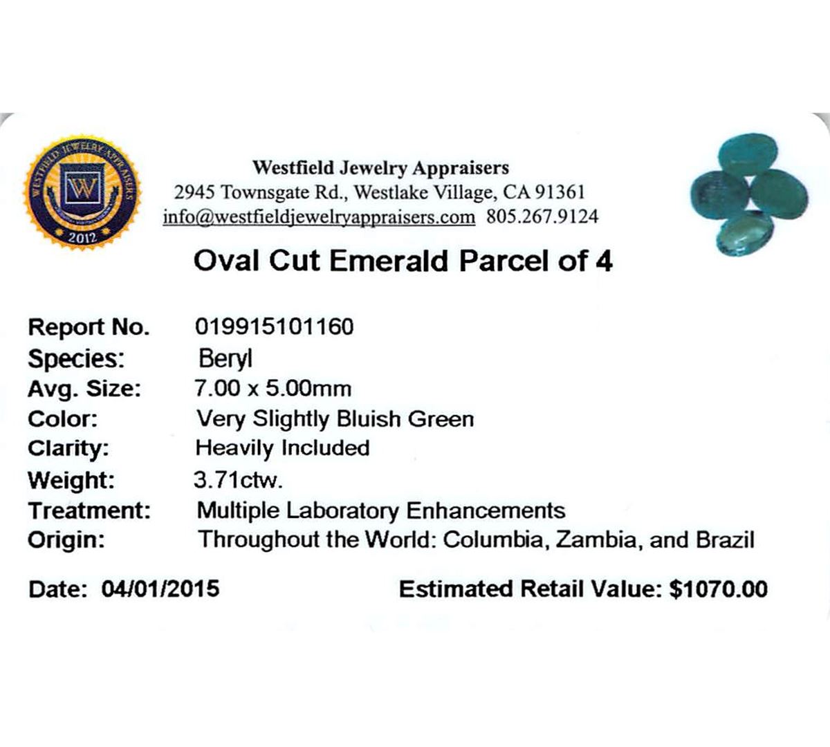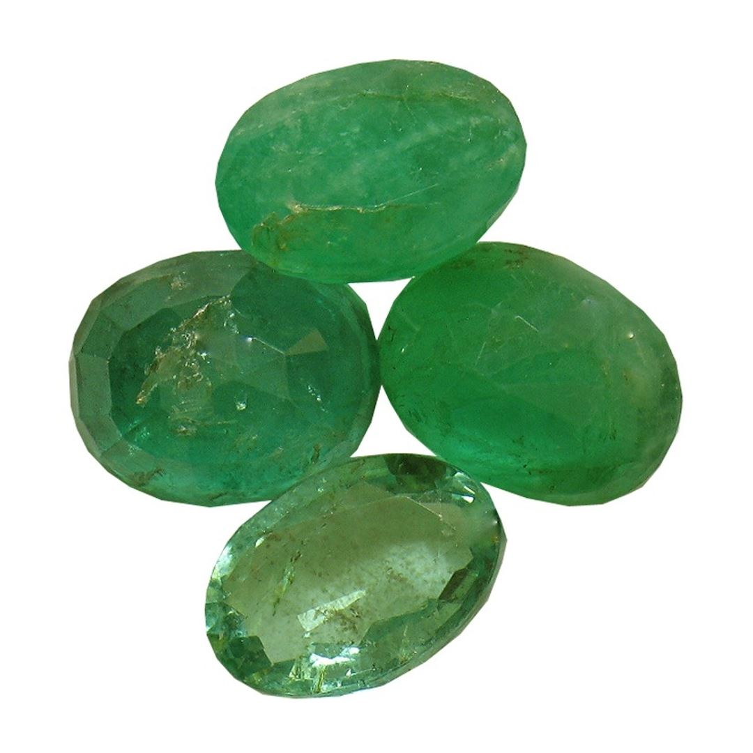 Four oval mixed cut natural emeralds exact total weight 3.71ct., clarity is heavily included, type III, medium dark, very slightly grayish, very slightly bluish green color, (GIA vslbG 6/3), cut is good. Westfield Appraised at $1,070.00.