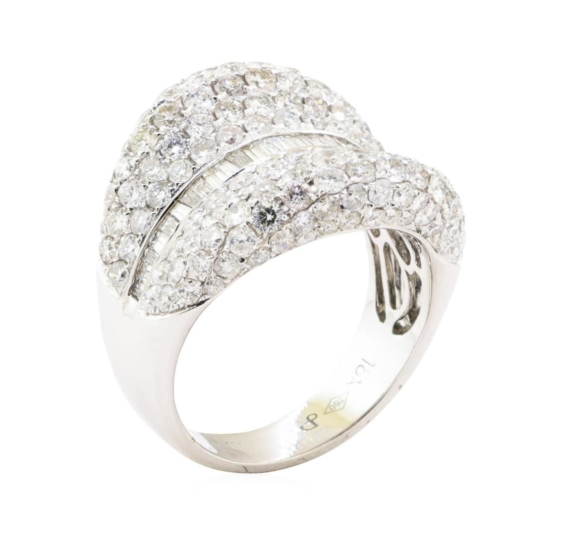 One electronically tested 18KT white gold lady's combination cast & assembled fashion ring with a wide band tapered saddle motif with a bright polish finish. The featured lady's ring has a shank measuring 4.10 millimeters wide. Identified with markings of '18K 750'. Condition is new, good workmanship. Containing: Thirty-One channel set baguette cut diamonds, measuring from 1.40 x 1.00 x 0.85mm (depth est.) to 1.90 x 1.10 x 0.94mm (depth est.) approximate total weight of 31 Stones = 0.43ct. Graded in the setting. Color H - I Clarity VS-2 to SI-1 Cut Very Good One Hundred Forty-Eight prong set round brilliant cut diamonds, measuring 2.00 - 1.60 x 1.12mm (depth est.) approximate total weight of 148 Stones = 3.29ct. Graded in the setting. Color H - I Clarity SI-1 to I-1 Cut Good. Total Weight of Diamonds 3.72ct.. Total Weight of Ring 9.10gm GAS Appraised at $10405.00. GAS Appraised.