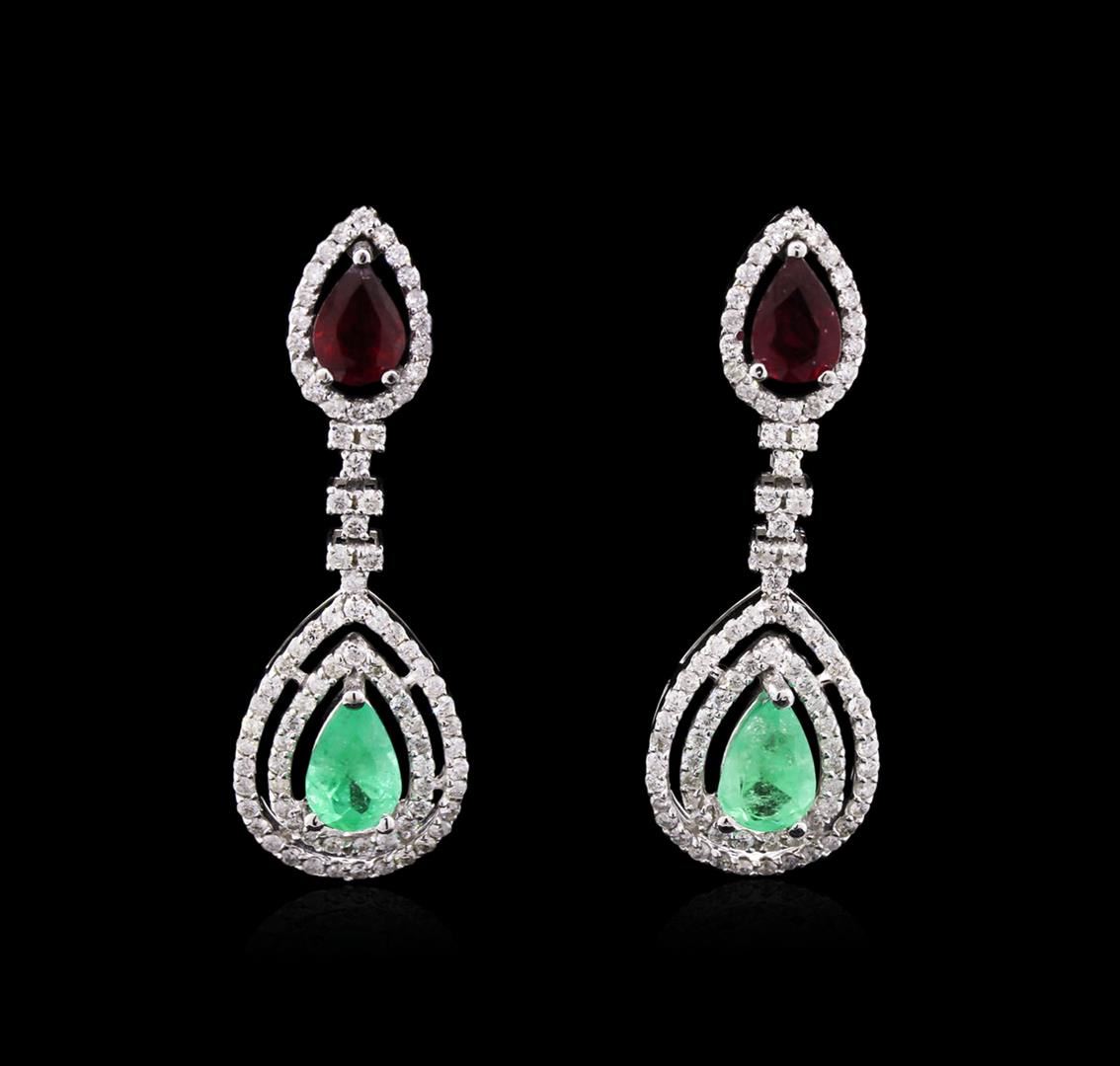 One pair electronically tested 14KT white gold lady's combination cast & assembled dangle earrings with friction posts with a bright polish finish. Identified with markings of "585". Condition is new, good workmanship. Containing: Two prong set pear modified brilliant cut natural emeralds, measuring 8.38 x 5.38 x 4.32mm, approximate total weight of 2.00ct., clarity is moderately included, type III, medium light, very slightly grayish, green color, (GIA G 4/3), cut is good. Naturally occurring internal & external characteristics are present. Indications of oil residue. Colored gemstones are presumed to have been subjected to commonly used enhancement processes. Graded in the setting. Two prong set pear modified brilliant cut natural rubies, measuring 7.20 x 4.98 x 3.00mm, approximate total weight of 1.72ct., clarity is moderately included, type II, medium dark, moderately strong, orangy red color, (GIA oR 6/4), cut is good. Indications of laboratory high temperature heat treatment, with glass & flux additives. Colored gemstones are presumed to have been subjected to commonly used enhancement processes. Graded in the setting. One Hundred Seventy prong set round brilliant cut diamonds, measuring 1.40 - 1.25 x 0.82mm (depth est.) approximate total weight of 170 Stones = 1.49ct. Graded in the setting. Clarity: SI-1 to I-1 . Color: H - J. Cut Good. Total Weight of Colored Stones 3.72ct.. Total Weight of Diamonds 1.49ct.. Total Weight of Earrings 9.40gm at $ 7385.00 GAS Appraised.