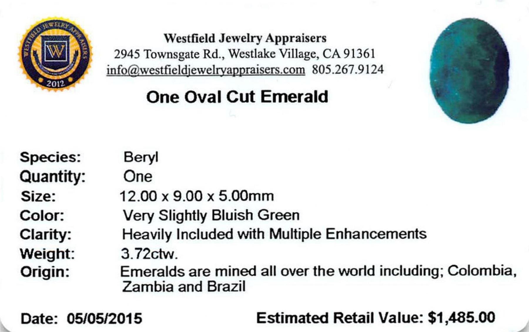 One oval mixed cut natural emerald, measuring 12.00 x 9.00 x 5.00mm, exact weight 3.72ct., clarity is heavily included, type III, medium dark, very slightly grayish, very slightly bluish green color, (GIA vslbG 6/3) Indications of multiple laboratory enhancements, including high temperature heat treatment._x000D_ Westfield Appraised.