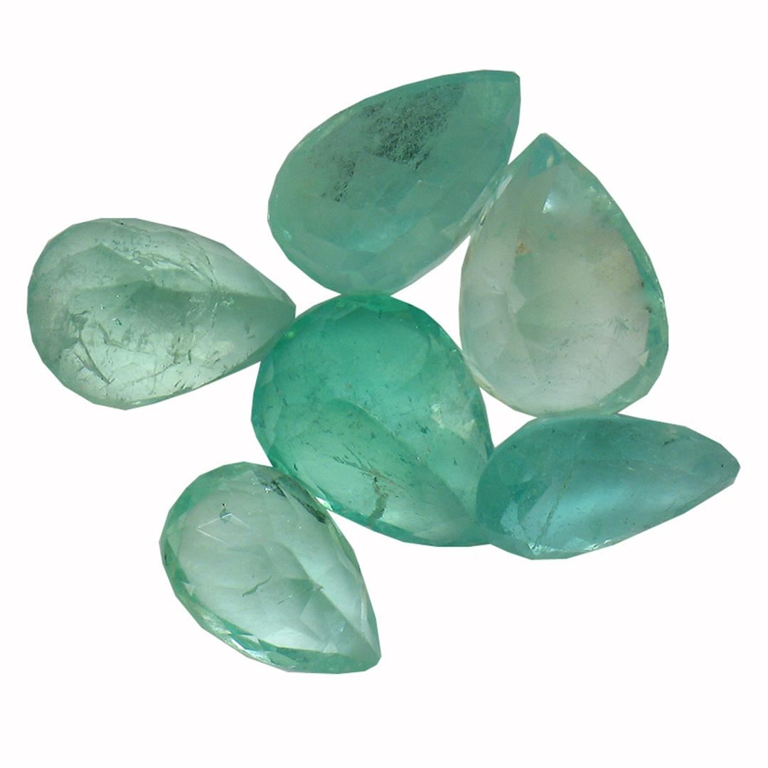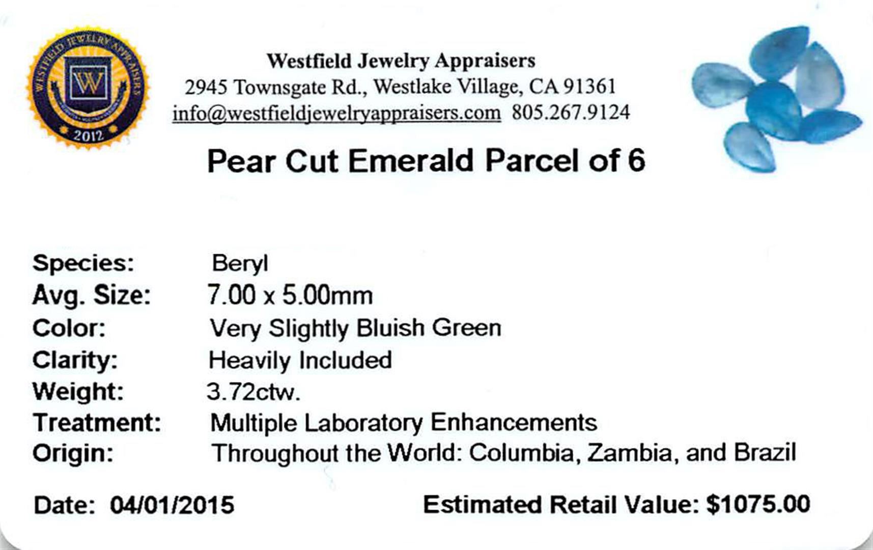 Six pear mixed cut natural emeralds exact total weight 3.72ct., clarity is heavily included, type III, medium, very slightly grayish, very slightly bluish green color, (GIA vslbG 5/3), cut is good. Westfield Appraised at $1,075.00.