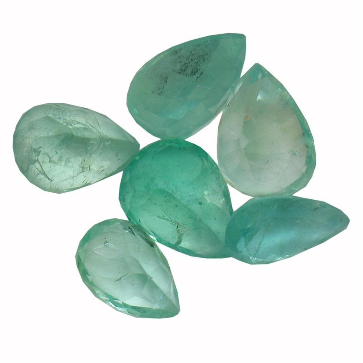 Six pear mixed cut natural emeralds exact total weight 3.72ct., clarity is heavily included, type III, medium, very slightly grayish, very slightly bluish green color, (GIA vslbG 5/3), cut is good. Westfield Appraised.