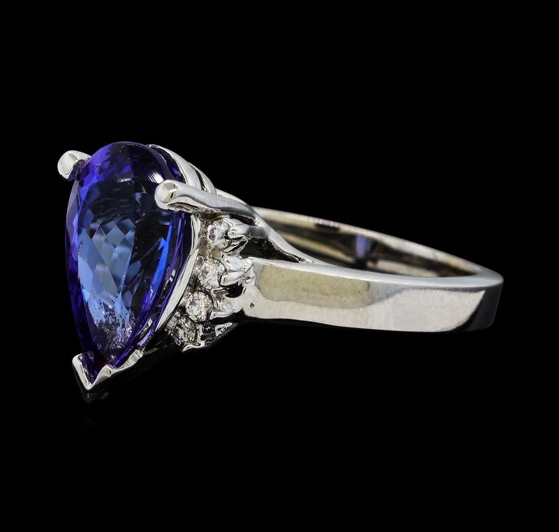 One electronically tested 14KT white gold lady's cast fashion ring with a cathedral shank with a bright polish finish. The featured lady's ring has a shank measuring 2.71 millimeters wide. Identified with markings of '14K'. Condition is new, good workmanship. Containing: One prong set pear modified brilliant cut natural tanzanite, measuring 13.50 x 7.70 x 5.42mm, (depth est.) approximate weight of 3.72ct., clarity is eye clean, medium dark, strong, violetish blue color, (GIA vB 6/5), cut is very good. Transmitting light with no distortion, transparent. Colored gemstones are presumed to have been subjected to commonly used enhancement processes. Graded in the setting. Eight prong set round brilliant cut diamonds, measuring 1.75 - 1.65 x 1.05mm (depth est.) approximate total weight of 8 Stones = 0.15ct. Graded in the setting. Clarity SI-1 to SI-2. Color: H - I Cut Good. Total Weight of Colored Stones 3.72ct.. Total Weight of Diamonds 0.15ct.. Total Weight of Ring 7.00gm. GAS Appraised at $7,905.00.