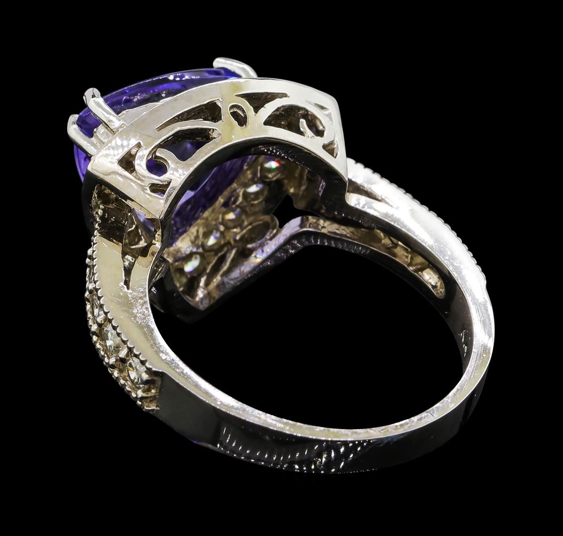 One electronically tested 14KT white gold lady's cast fashion ring with a cathedral halo with a bright polish with milgrain detailing finish. The featured lady's ring has a shank measuring 2.60 millimeters wide. Identified with markings of 'K14'. Condition is new, good workmanship. Containing: One prong set triangle modified brilliant cut natural tanzanite, measuring 10.85 x 10.80 x 5.35mm, (depth est.) approximate weight of 3.72ct., clarity is eye clean, medium, moderately strong, bluish violet color, (GIA bV 5/4), cut is very good. Transmitting light with no distortion, transparent. Colored gemstones are presumed to have been subjected to commonly used enhancement processes. Graded in the setting. Ten prong set round brilliant cut diamonds, measuring 2.20 - 2.15 x 1.33mm (depth est.) approximate total weight of 10 Stones = 0.38ct. Graded in the setting. Clarity SI-1 to I-1. Color: H - I Cut Good Twenty-One bead set round brilliant cut diamonds, measuring 1.75 - 1.65 x 1.05mm (depth est.) approximate total weight of 21 Stones = 0.40ct. Graded in the setting. Clarity SI-1 to SI-2. Color: H - I Cut Good. Total Weight of Colored Stones 3.72ct.. Total Weight of Diamonds 0.78ct.. Total Weight of Ring 6.80gm. GAS Appraised at $8,645.00.