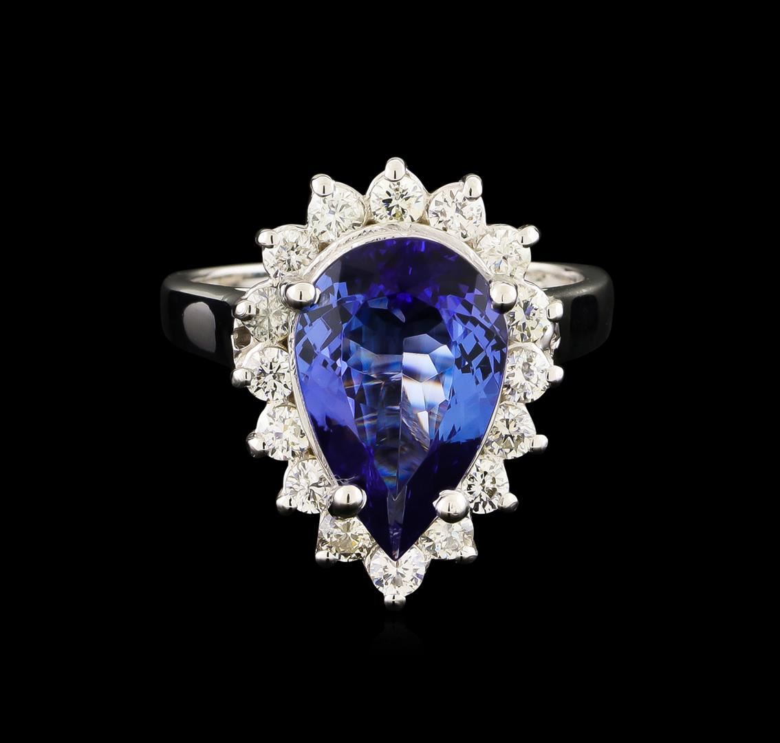 One electronically tested 14KT white gold lady's cast fashion ring with a basket halo with a bright polish finish. The featured lady's ring has a shank measuring 2.48 millimeters wide. Identified with markings of "14K". Condition is new, good workmanship. Containing: One prong set pear modified brilliant cut natural tanzanite, measuring 13.92 x 9.06 x 4.83mm, approximate weight of 3.72ct., clarity is eye clean, medium, moderately strong, violetish blue color, (GIA vB 5/4), cut is very good. Transmitting light with no distortion, transparent. Colored gemstones are presumed to have been subjected to commonly used enhancement processes. Graded in the setting. Sixteen prong set round brilliant cut diamonds, measuring 2.40 - 2.30 x 1.46mm (depth est.) approximate total weight of 16 Stones = 0.78ct. Graded in the setting. Clarity: SI-1 to SI-2. Color: H - I. Cut Good. Total Weight of Colored Stones 3.72ct. Total Weight of Diamonds 0.78ct. Total Weight of Ring 6.30gm. GAS Appraised at $8,670.00.