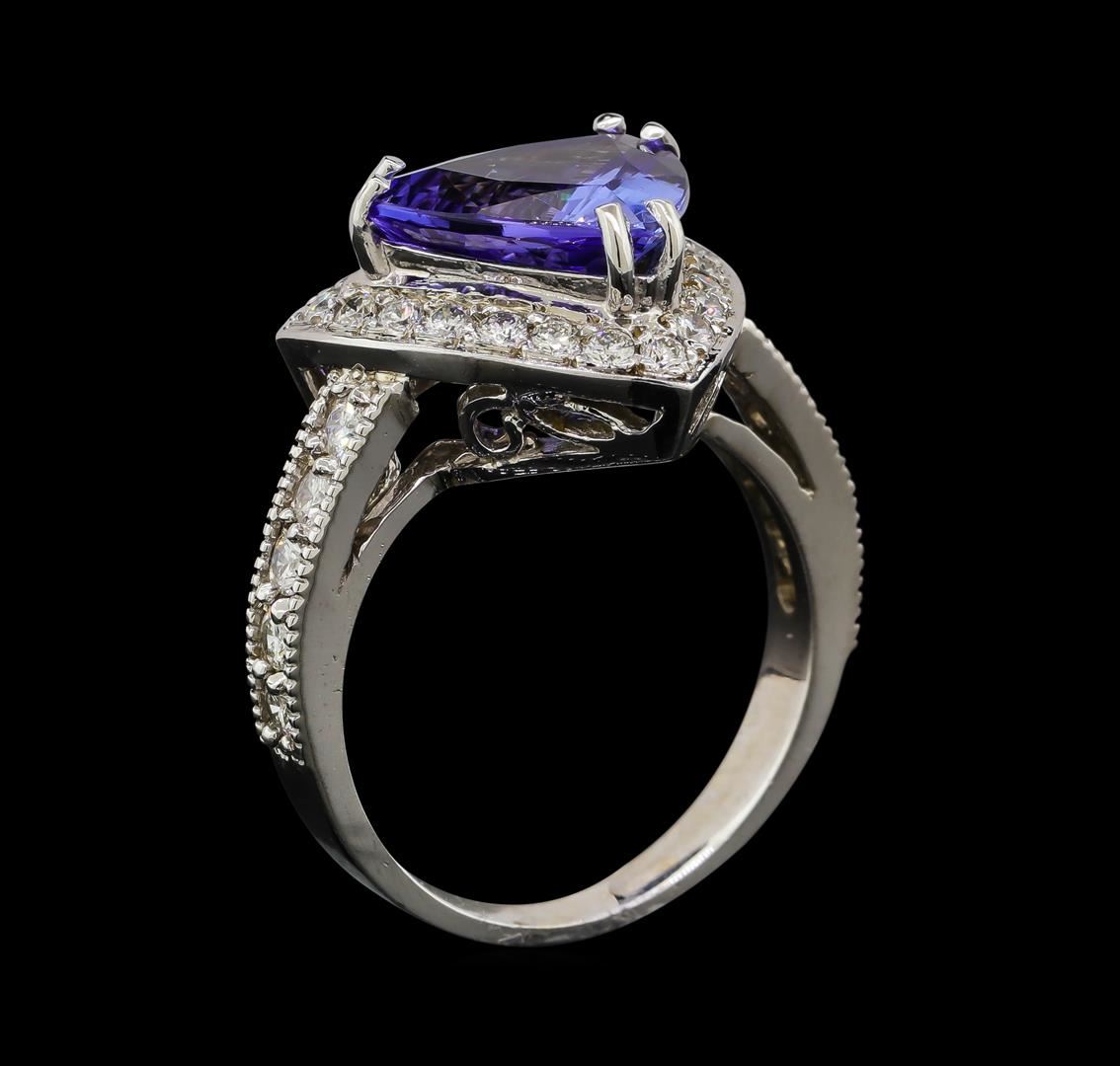 One electronically tested 14KT white gold lady's cast fashion ring with a cathedral halo with a bright polish with milgrain detailing finish. The featured lady's ring has a shank measuring 2.60 millimeters wide. Identified with markings of 'K14'. Condition is new, good workmanship. Containing: One prong set triangle modified brilliant cut natural tanzanite, measuring 10.85 x 10.80 x 5.35mm, (depth est.) approximate weight of 3.72ct., clarity is eye clean, medium, moderately strong, bluish violet color, (GIA bV 5/4), cut is very good. Transmitting light with no distortion, transparent. Colored gemstones are presumed to have been subjected to commonly used enhancement processes. Graded in the setting. Ten prong set round brilliant cut diamonds, measuring 2.20 - 2.15 x 1.33mm (depth est.) approximate total weight of 10 Stones = 0.38ct. Graded in the setting. Clarity SI-1 to I-1. Color: H - I Cut Good Twenty-One bead set round brilliant cut diamonds, measuring 1.75 - 1.65 x 1.05mm (depth est.) approximate total weight of 21 Stones = 0.40ct. Graded in the setting. Clarity SI-1 to SI-2. Color: H - I Cut Good. Total Weight of Colored Stones 3.72ct.. Total Weight of Diamonds 0.78ct.. Total Weight of Ring 6.80gm. GAS Appraised at $8,645.00.
