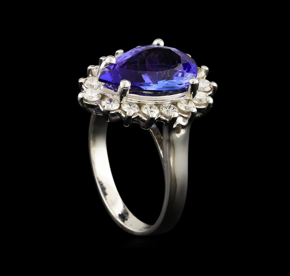 One electronically tested 14KT white gold lady's cast fashion ring with a basket halo with a bright polish finish. The featured lady's ring has a shank measuring 2.48 millimeters wide. Identified with markings of "14K". Condition is new, good workmanship. Containing: One prong set pear modified brilliant cut natural tanzanite, measuring 13.92 x 9.06 x 4.83mm, approximate weight of 3.72ct., clarity is eye clean, medium, moderately strong, violetish blue color, (GIA vB 5/4), cut is very good. Transmitting light with no distortion, transparent. Colored gemstones are presumed to have been subjected to commonly used enhancement processes. Graded in the setting. Sixteen prong set round brilliant cut diamonds, measuring 2.40 - 2.30 x 1.46mm (depth est.) approximate total weight of 16 Stones = 0.78ct. Graded in the setting. Clarity: SI-1 to SI-2. Color: H - I. Cut Good. Total Weight of Colored Stones 3.72ct. Total Weight of Diamonds 0.78ct. Total Weight of Ring 6.30gm. GAS Appraised at $8,670.00.
