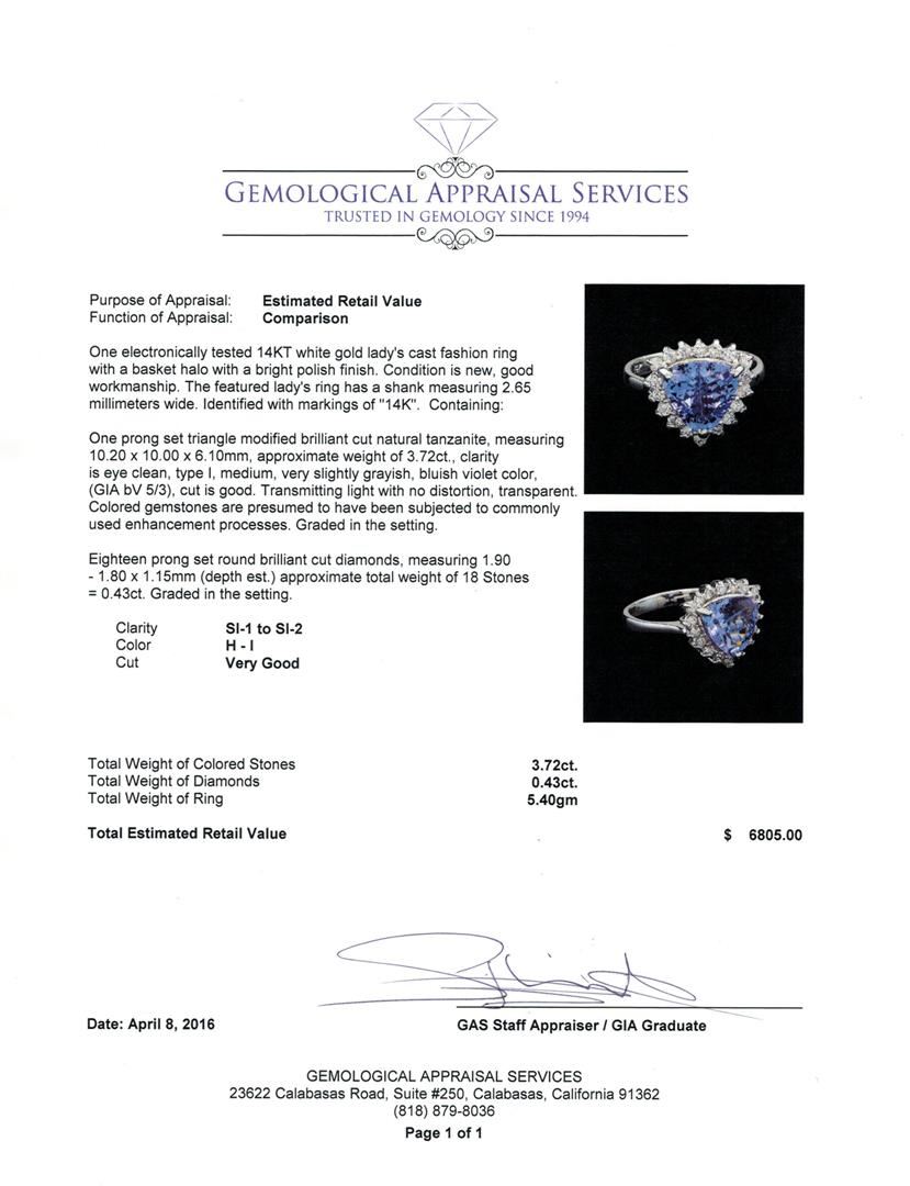 One electronically tested 14KT white gold lady's cast fashion ring with a basket halo with a bright polish finish. The featured lady's ring has a shank measuring 2.65 millimeters wide. Identified with markings of "14K". Condition is new, good workmanship. Containing: One prong set triangle modified brilliant cut natural tanzanite, measuring 10.20 x 10.00 x 6.10mm, approximate weight of 3.72ct., clarity is eye clean, type I, medium, very slightly grayish, bluish violet color, (GIA bV 5/3), cut is good. Transmitting light with no distortion, transparent. Colored gemstones are presumed to have been subjected to commonly used enhancement processes. Graded in the setting. Eighteen prong set round brilliant cut diamonds, measuring 1.90 - 1.80 x 1.15mm (depth est.) approximate total weight of 18 Stones = 0.43ct. Graded in the setting. Clarity: SI-1 to SI-2. Color: H - I. Cut Very Good. Total Weight of Colored Stones 3.72ct. Total Weight of Diamonds 0.43ct. Total Weight of Ring 5.40gm. GAS Appraised at $6,805.00.