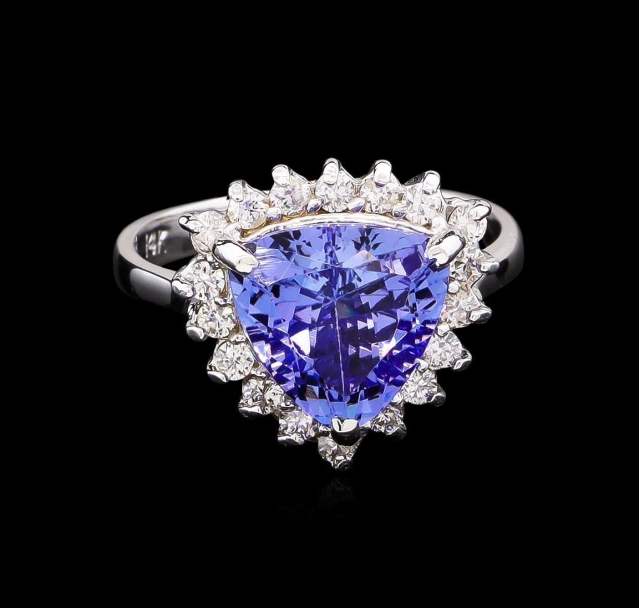 One electronically tested 14KT white gold lady's cast fashion ring with a basket halo with a bright polish finish. The featured lady's ring has a shank measuring 2.65 millimeters wide. Identified with markings of "14K". Condition is new, good workmanship. Containing: One prong set triangle modified brilliant cut natural tanzanite, measuring 10.20 x 10.00 x 6.10mm, approximate weight of 3.72ct., clarity is eye clean, type I, medium, very slightly grayish, bluish violet color, (GIA bV 5/3), cut is good. Transmitting light with no distortion, transparent. Colored gemstones are presumed to have been subjected to commonly used enhancement processes. Graded in the setting. Eighteen prong set round brilliant cut diamonds, measuring 1.90 - 1.80 x 1.15mm (depth est.) approximate total weight of 18 Stones = 0.43ct. Graded in the setting. Clarity: SI-1 to SI-2. Color: H - I. Cut Very Good. Total Weight of Colored Stones 3.72ct. Total Weight of Diamonds 0.43ct. Total Weight of Ring 5.40gm. GAS Appraised.