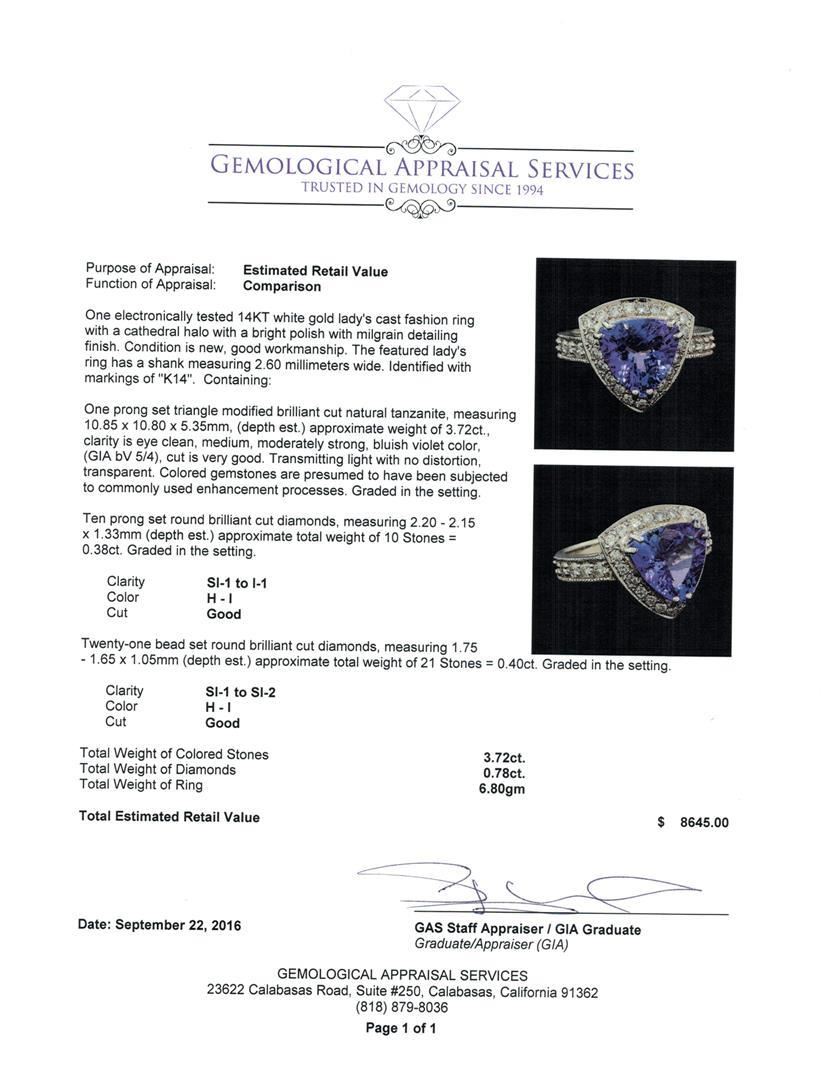 One electronically tested 14KT white gold lady's cast fashion ring with a cathedral halo with a bright polish with milgrain detailing finish. The featured lady's ring has a shank measuring 2.60 millimeters wide. Identified with markings of 'K14'. Condition is new, good workmanship. Containing: One prong set triangle modified brilliant cut natural tanzanite, measuring 10.85 x 10.80 x 5.35mm, (depth est.) approximate weight of 3.72ct., clarity is eye clean, medium, moderately strong, bluish violet color, (GIA bV 5/4), cut is very good. Transmitting light with no distortion, transparent. Colored gemstones are presumed to have been subjected to commonly used enhancement processes. Graded in the setting. Ten prong set round brilliant cut diamonds, measuring 2.20 - 2.15 x 1.33mm (depth est.) approximate total weight of 10 Stones = 0.38ct. Graded in the setting. Clarity SI-1 to I-1. Color: H - I Cut Good Twenty-One bead set round brilliant cut diamonds, measuring 1.75 - 1.65 x 1.05mm (depth est.) approximate total weight of 21 Stones = 0.40ct. Graded in the setting. Clarity SI-1 to SI-2. Color: H - I Cut Good. Total Weight of Colored Stones 3.72ct.. Total Weight of Diamonds 0.78ct.. Total Weight of Ring 6.80gm.