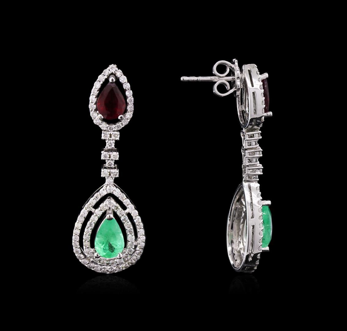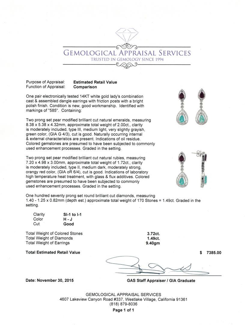 One pair electronically tested 14KT white gold lady's combination cast & assembled dangle earrings with friction posts with a bright polish finish. Identified with markings of "585". Condition is new, good workmanship. Containing: Two prong set pear modified brilliant cut natural emeralds, measuring 8.38 x 5.38 x 4.32mm, approximate total weight of 2.00ct., clarity is moderately included, type III, medium light, very slightly grayish, green color, (GIA G 4/3), cut is good. Naturally occurring internal & external characteristics are present. Indications of oil residue. Colored gemstones are presumed to have been subjected to commonly used enhancement processes. Graded in the setting. Two prong set pear modified brilliant cut natural rubies, measuring 7.20 x 4.98 x 3.00mm, approximate total weight of 1.72ct., clarity is moderately included, type II, medium dark, moderately strong, orangy red color, (GIA oR 6/4), cut is good. Indications of laboratory high temperature heat treatment, with glass & flux additives. Colored gemstones are presumed to have been subjected to commonly used enhancement processes. Graded in the setting. One Hundred Seventy prong set round brilliant cut diamonds, measuring 1.40 - 1.25 x 0.82mm (depth est.) approximate total weight of 170 Stones = 1.49ct. Graded in the setting. Clarity: SI-1 to I-1 . Color: H - J. Cut Good. Total Weight of Colored Stones 3.72ct.. Total Weight of Diamonds 1.49ct.. Total Weight of Earrings 9.40gm at $ 7385.00 GAS Appraised.