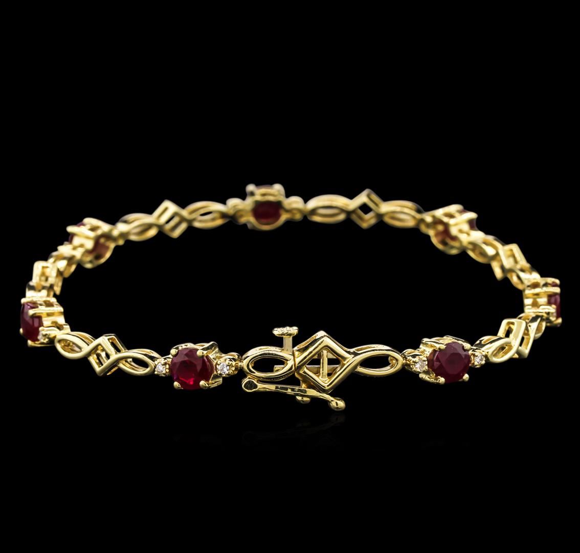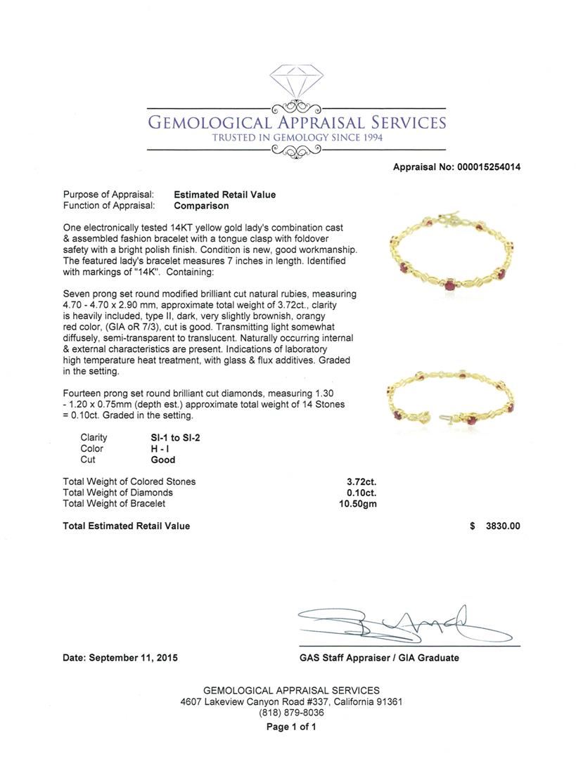 One electronically tested 14KT yellow gold lady's combination cast & assembled fashion bracelet with a tongue clasp with foldover safety with a bright polish finish. The featured lady's bracelet measures 7 inches in length. Identified with markings of "14K". Condition is new, good workmanship. Containing: Seven prong set round modified brilliant cut natural rubies, measuring 4.70 - 4.70 x 2.90 mm, approximate total weight of 3.72ct., clarity is heavily included, type II, dark, very slightly brownish, orangy red color, (GIA oR 7/3), cut is good. Transmitting light somewhat diffusely, semi-transparent to translucent. Naturally occurring internal & external characteristics are present. Indications of laboratory high temperature heat treatment, with glass & flux additives. Graded in the setting. Fourteen prong set round brilliant cut diamonds, measuring 1.30 - 1.20 x 0.75mm (depth est.) approximate total weight of 14 Stones = 0.10ct. Graded in the setting. Clarity: SI-1 to SI-2. Color: H - I. Cut Good. Total Weight of Colored Stones 3.72ct. Total Weight of Diamonds 0.10ct. Total Weight of Bracelet 10.50gm. GAS Appraised at $3,830.00.