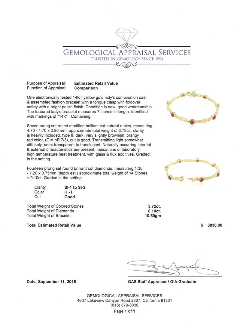 One electronically tested 14KT yellow gold lady's combination cast & assembled fashion bracelet with a tongue clasp with foldover safety with a bright polish finish. The featured lady's bracelet measures 7 inches in length. Identified with markings of "14K". Condition is new, good workmanship. Containing: Seven prong set round modified brilliant cut natural rubies, measuring 4.70 - 4.70 x 2.90 mm, approximate total weight of 3.72ct., clarity is heavily included, type II, dark, very slightly brownish, orangy red color, (GIA oR 7/3), cut is good. Transmitting light somewhat diffusely, semi-transparent to translucent. Naturally occurring internal & external characteristics are present. Indications of laboratory high temperature heat treatment, with glass & flux additives. Graded in the setting. Fourteen prong set round brilliant cut diamonds, measuring 1.30 - 1.20 x 0.75mm (depth est.) approximate total weight of 14 Stones = 0.10ct. Graded in the setting. Clarity: SI-1 to SI-2. Color: H - I. Cut Good. Total Weight of Colored Stones 3.72ct. Total Weight of Diamonds 0.10ct. Total Weight of Bracelet 10.50gm. GAS Appraised at $3,830.00.