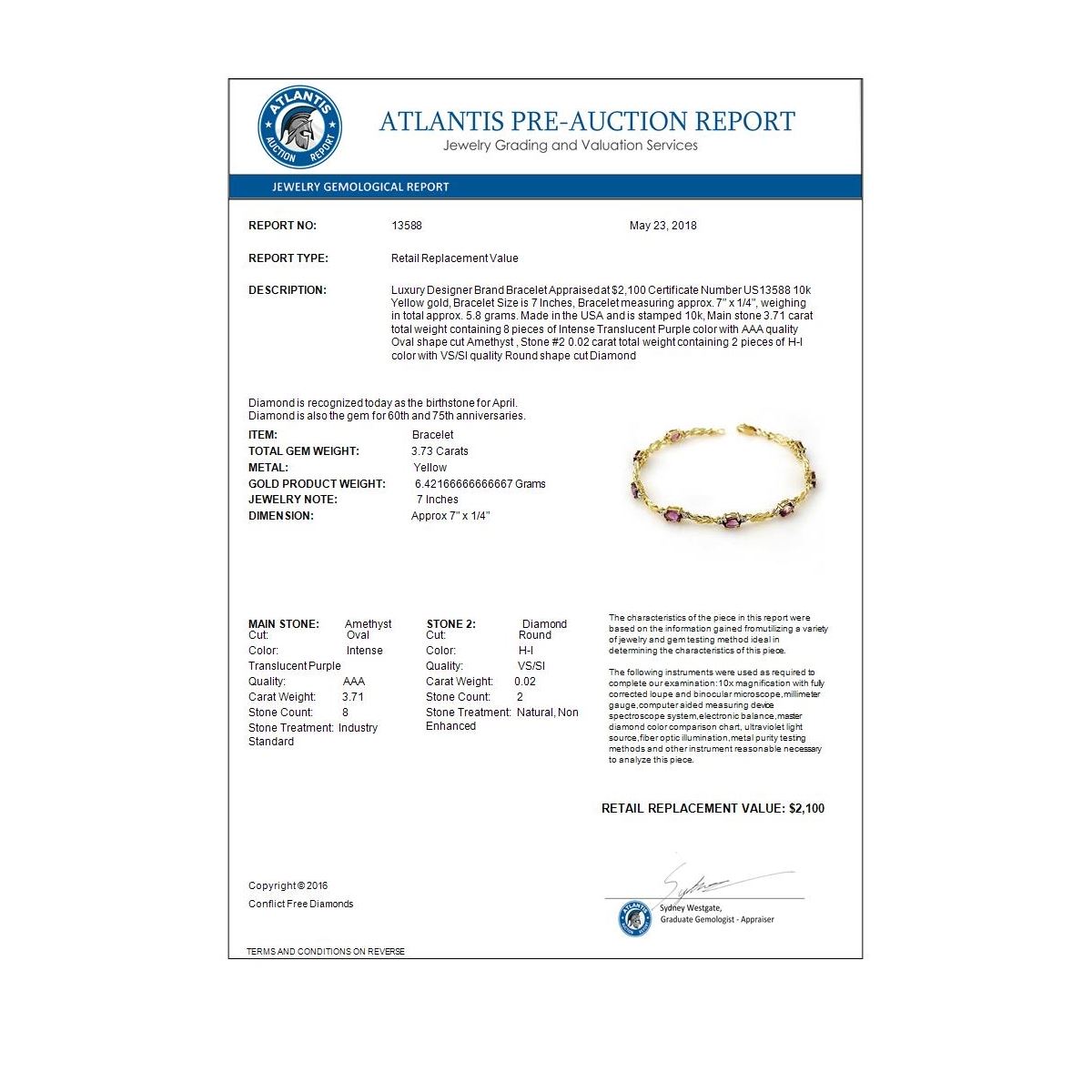 REF-32X2T -13588 ---- 3.73 CTW Amethyst & Diamond Bracelet 10K Yellow Gold ---- Luxury Designer Brand Bracelet Appraised at $2,100 Certificate Number US13588 10k Yellow gold, Bracelet Size is 7 Inches, Bracelet measuring approx. 7" x 1/4", weighing in total approx. 5.8 grams. Made in the USA and is stamped 10k, Main stone 3.71 carat total weight containing 8 pieces of Intense Translucent Purple color with AAA quality Oval shape cut Amethyst , Stone #2 0.02 carat total weight containing 2 pieces of H-I color with VS/SI quality Round shape cut Diamond