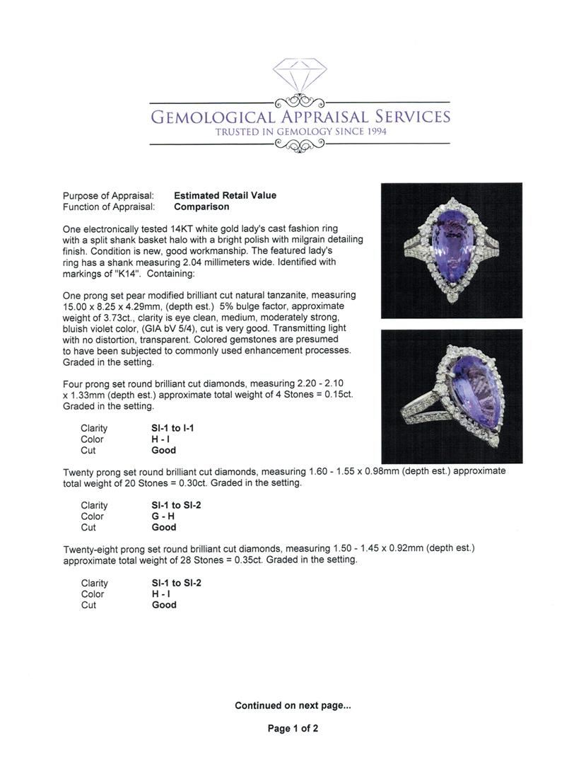 One electronically tested 14KT white gold lady's cast fashion ring with a split shank basket halo with a bright polish with milgrain detailing finish. The featured lady's ring has a shank measuring 2.04 millimeters wide. Identified with markings of 'K14'. Condition is new, good workmanship. Containing: One prong set pear modified brilliant cut natural tanzanite, measuring 15.00 x 8.25 x 4.29mm, (depth est.) 5%. bulge factor, approximate weight of 3.73ct., clarity is eye clean, medium, moderately strong, bluish violet color, (GIA bV 5/4), cut is very good. Transmitting light with no distortion, transparent. Colored gemstones are presumed to have been subjected to commonly used enhancement processes. Graded in the setting. Four prong set round brilliant cut diamonds, measuring 2.20 - 2.10 x 1.33mm (depth est.) approximate total weight of 4 Stones = 0.15ct. Graded in the setting. Clarity SI-1 to I-1. Color: H - I Cut Good Twenty prong set round brilliant cut diamonds, measuring 1.60 - 1.55 x 0.98mm (depth est.) approximate total weight of 20 Stones = 0.30ct. Graded in the setting. Clarity SI-1 to SI-2. Color: G - H Cut Good Twenty-Eight prong set round brilliant cut diamonds, measuring 1.50 - 1.45 x 0.92mm (depth est.) approximate total weight of 28 Stones = 0.35ct. Graded in the setting. Clarity SI-1 to SI-2. Color: H - I Cut Good. Total Weight of Colored Stones 3.73ct.. Total Weight of Diamonds 0.80ct.. Total Weight of Ring 5.10gm. GAS Appraised at $8,675.00.