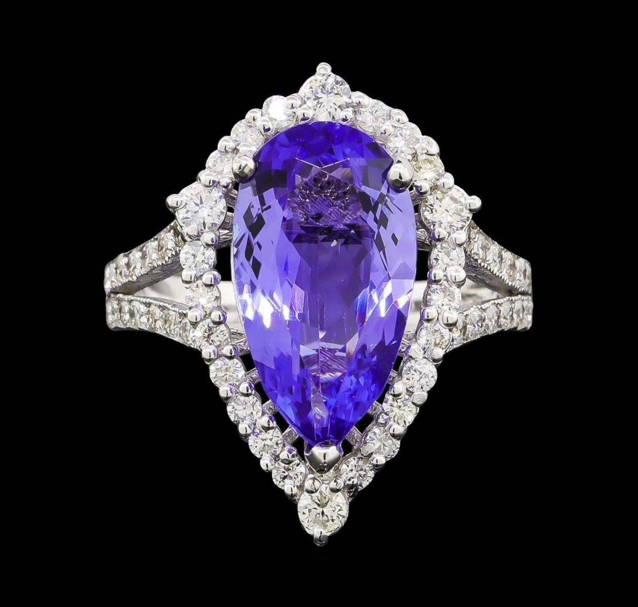 One electronically tested 14KT white gold lady's cast fashion ring with a split shank basket halo with a bright polish with milgrain detailing finish. The featured lady's ring has a shank measuring 2.04 millimeters wide. Identified with markings of 'K14'. Condition is new, good workmanship. Containing: One prong set pear modified brilliant cut natural tanzanite, measuring 15.00 x 8.25 x 4.29mm, (depth est.) 5%. bulge factor, approximate weight of 3.73ct., clarity is eye clean, medium, moderately strong, bluish violet color, (GIA bV 5/4), cut is very good. Transmitting light with no distortion, transparent. Colored gemstones are presumed to have been subjected to commonly used enhancement processes. Graded in the setting. Four prong set round brilliant cut diamonds, measuring 2.20 - 2.10 x 1.33mm (depth est.) approximate total weight of 4 Stones = 0.15ct. Graded in the setting. Clarity SI-1 to I-1. Color: H - I Cut Good Twenty prong set round brilliant cut diamonds, measuring 1.60 - 1.55 x 0.98mm (depth est.) approximate total weight of 20 Stones = 0.30 ct. Graded in the setting. Clarity SI-1 to SI-2. Color: G - H Cut Good Twenty-Eight prong set round brilliant cut diamonds, measuring 1.50 - 1.45 x 0.92mm (depth est.) approximate total weight of 28 Stones = 0.35ct. Graded in the setting. Clarity SI-1 to SI-2. Color: H - I Cut Good. Total Weight of Colored Stones 3.73ct.. Total Weight of Diamonds 0.80 ct.. Total Weight of Ring 5.10gm. GAS Appraised.