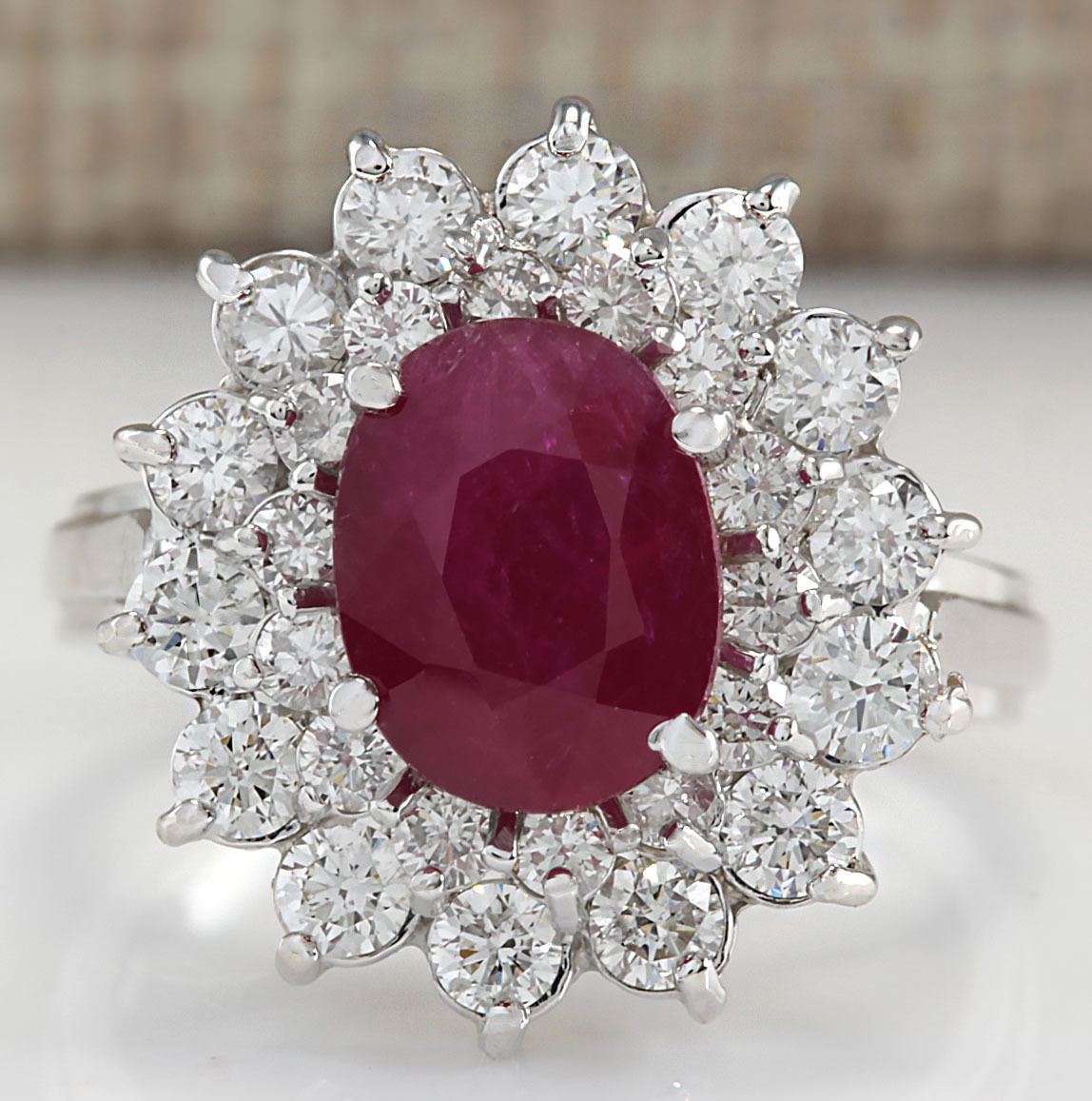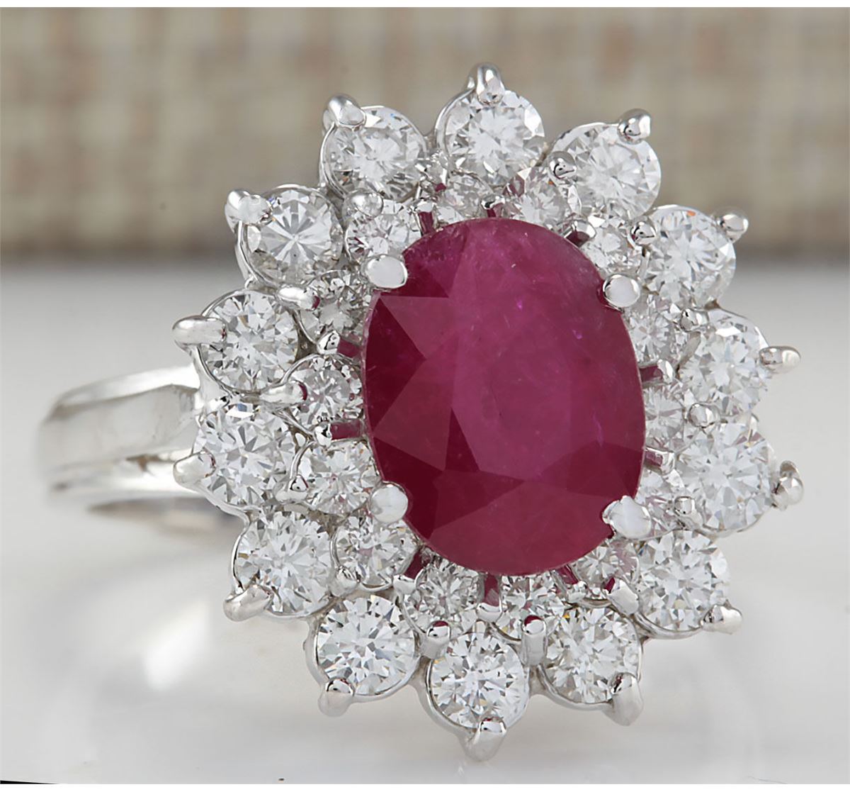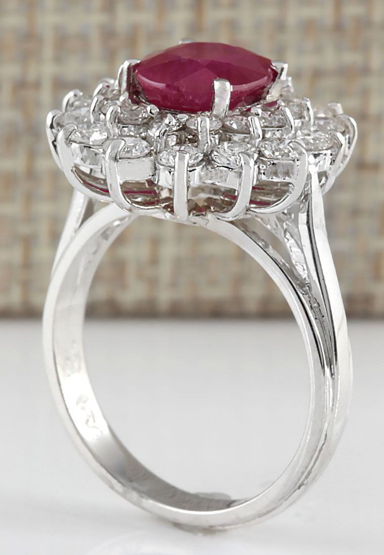 Stamped: 14K Ring Size: 6 Total Ring Weight: 5 Grams Diamond Weight: Total natural diamond weight is 1.25carat. SI1-SI2 clarity / G-H color Gemstone Weight: Total Natural Ruby Weight is 2.45ctw (Measures: 9.13x7.30mm) No glass or led filling heated only. Face Measures: 17.50x16.33mm Main stone color: Red [SKU:702321]