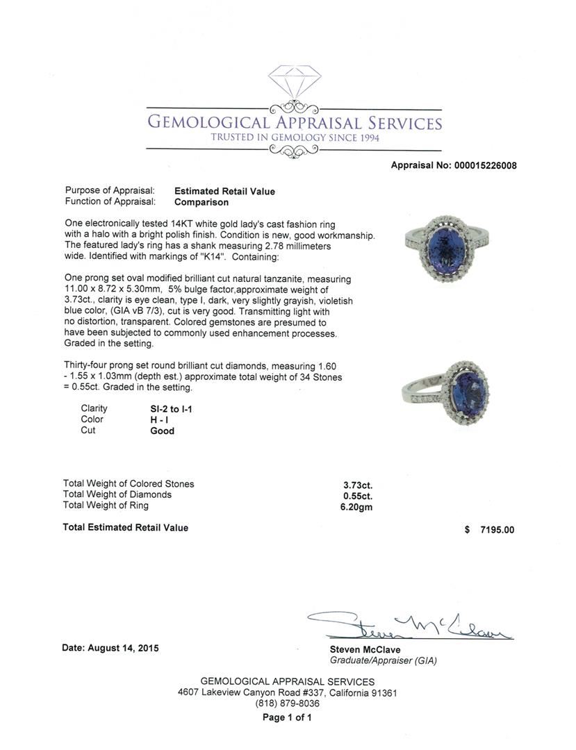 One electronically tested 14KT white gold lady's cast fashion ring with a halo with a bright polish finish. The featured lady's ring has a shank measuring 2.78 millimeters wide. Identified with markings of "K14". Condition is new, good workmanship. Contai GAS Appraised at $7,195.00.
