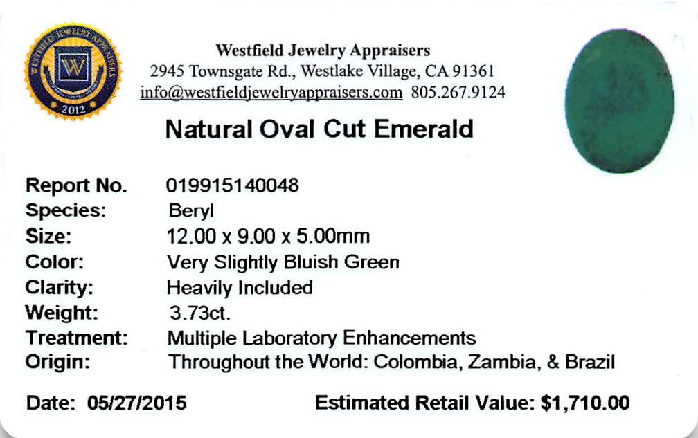One oval mixed cut natural emerald, measuring 12.00 x 9.00 x 5.00mm, exact weight 3.73ct., clarity is heavily included, type III, medium dark, very slightly grayish, very slightly bluish green color, (GIA vslbG 6/3), cut is good. Transmitting light somewhat diffusely, translucent, Naturally occurring internal & external characteristics are present, Indications of multiple laboratory enhancements, including high temperature heat treatment. Westfield Appraised at $1,710.00.