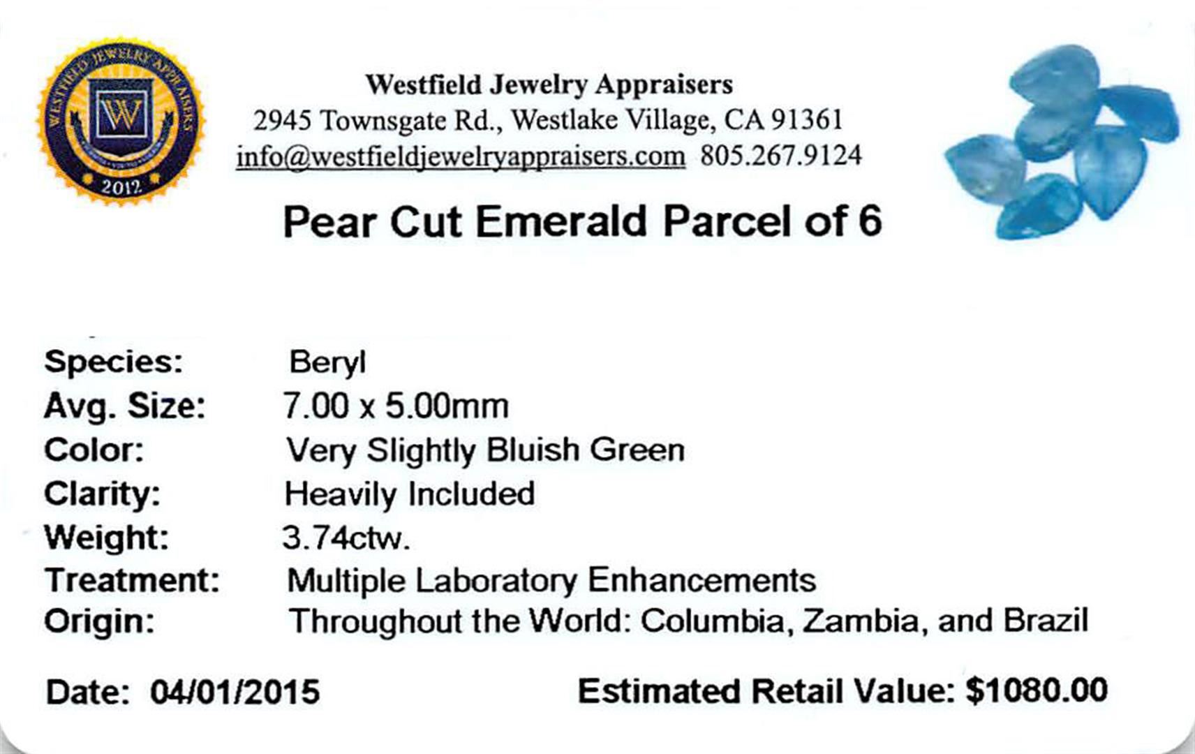 Six pear mixed cut natural emeralds exact total weight 3.74ct., clarity is heavily included, type III, medium, very slightly grayish, very slightly bluish green color, (GIA vslbG 5/3), cut is good. Westfield Appraised at $1,080.00.